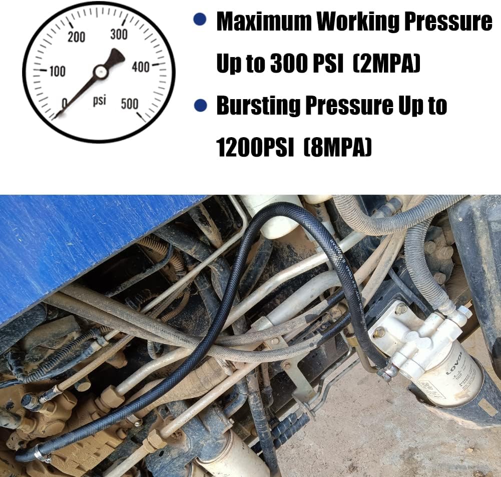 ✅ HIGH PSI RATING – The 1/2 hose has a pressure rating of 300 PSI Working Pressure, and holds up to a max of 1200 PSI. The 1/2 fuel line hose thrive across the temperature range of -95°F to 257°F. The 1/2 transmission hose has good retardancy and excellent corrosion resistance.