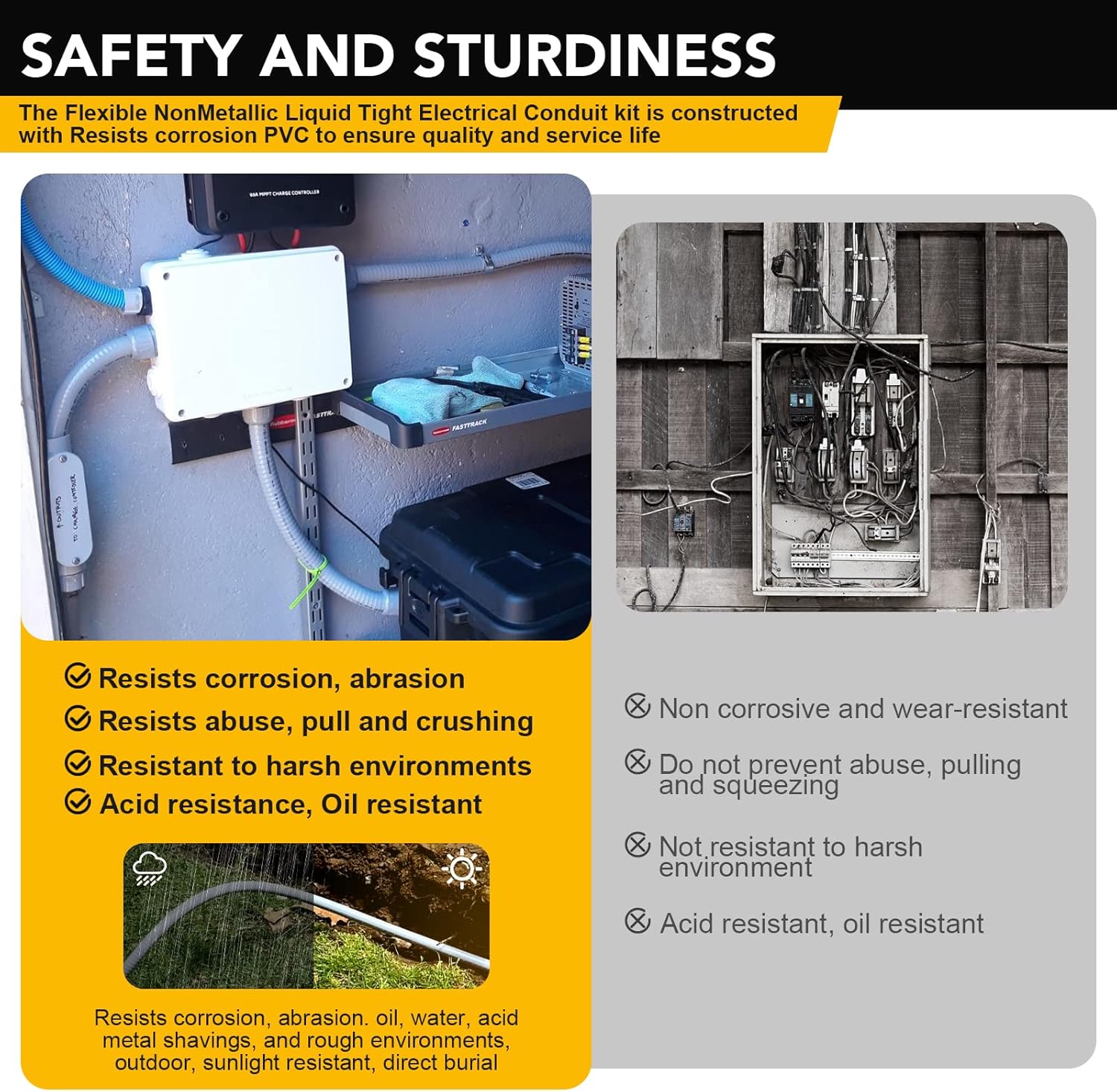 【Safety and Sturdiness】-Resists corrosion, abrasion, oil, water, acid, metal shavings, and rough environments; resists abuse, pull and crushing; outdoor, sunlight resistant, direct burial,50% lighter than metallic conduits