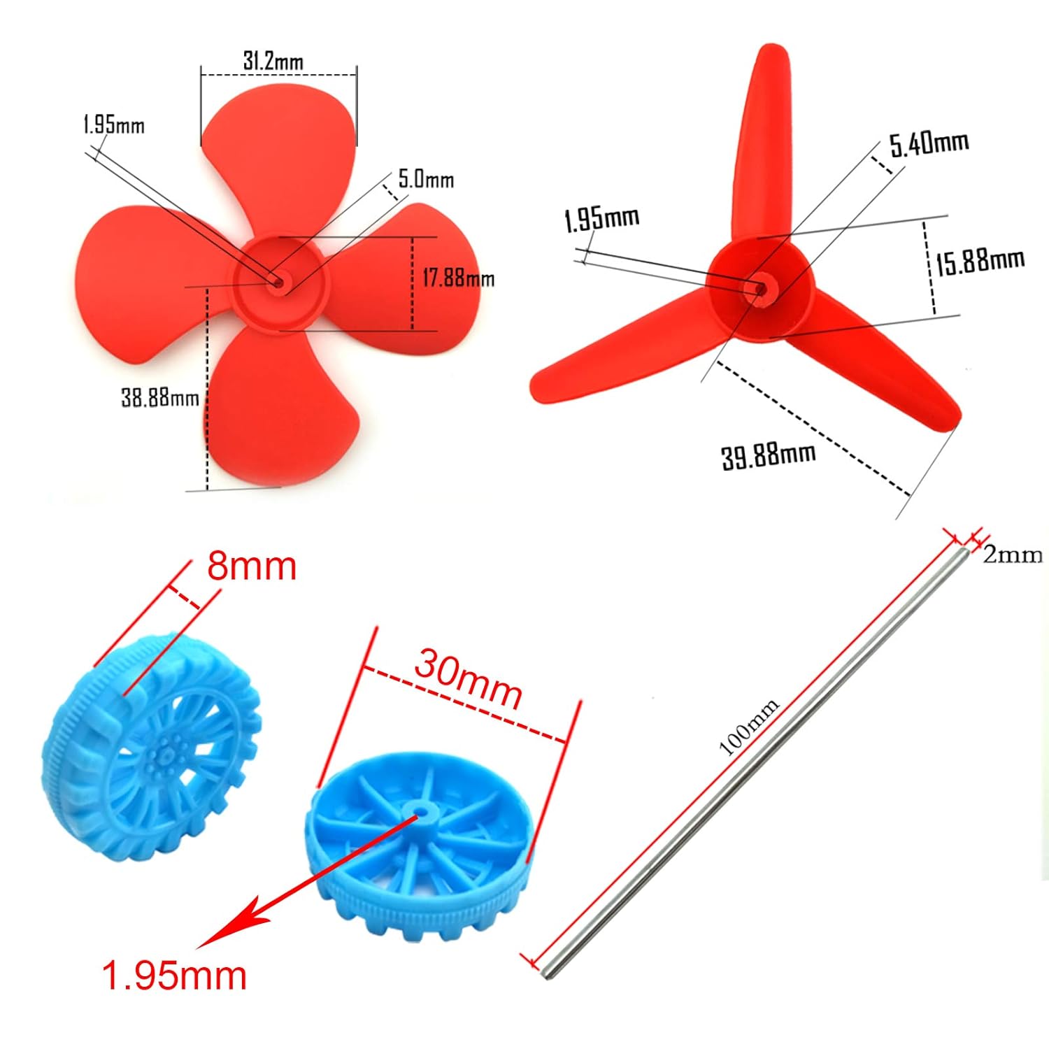 Package including:18pcs DC motor,18pcs 9V Battery Clip Connector,18pcs 2 x AA Battery Holder,18pcs motor mounting bracket,18pcs boat rocker switches,36pcs x electronic wire(25cm),24pcs Plastic wheels,12pcs 2*100mm shaft,12pcs 4 vanes propeller,6pcs 3 vanes propeller and 3pcs 40cmΦ3 Heat shrink tube