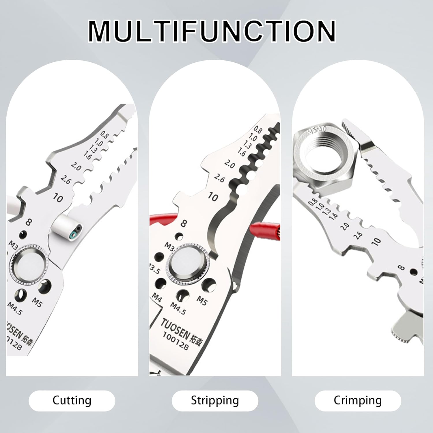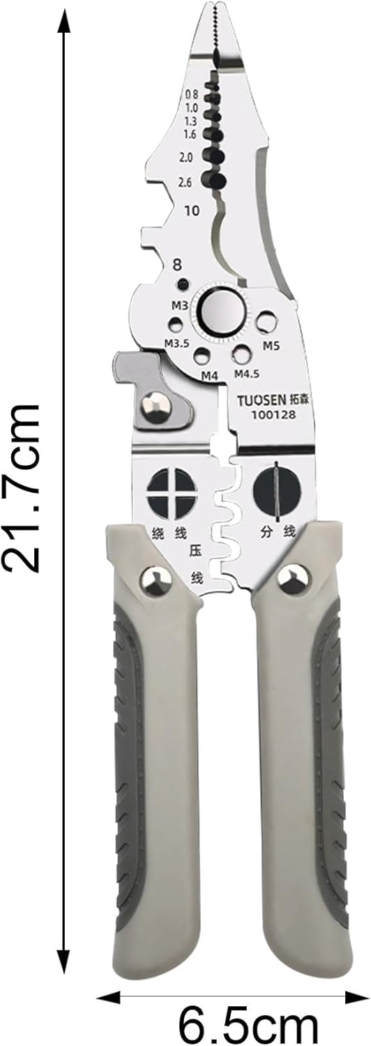 Practical Multi-function Tool meets a variety of electrician operation requirements such as cutting the wire, stripping, crimping, winding, splitting, clamping, and wrenching Precise wire stripping hole design.