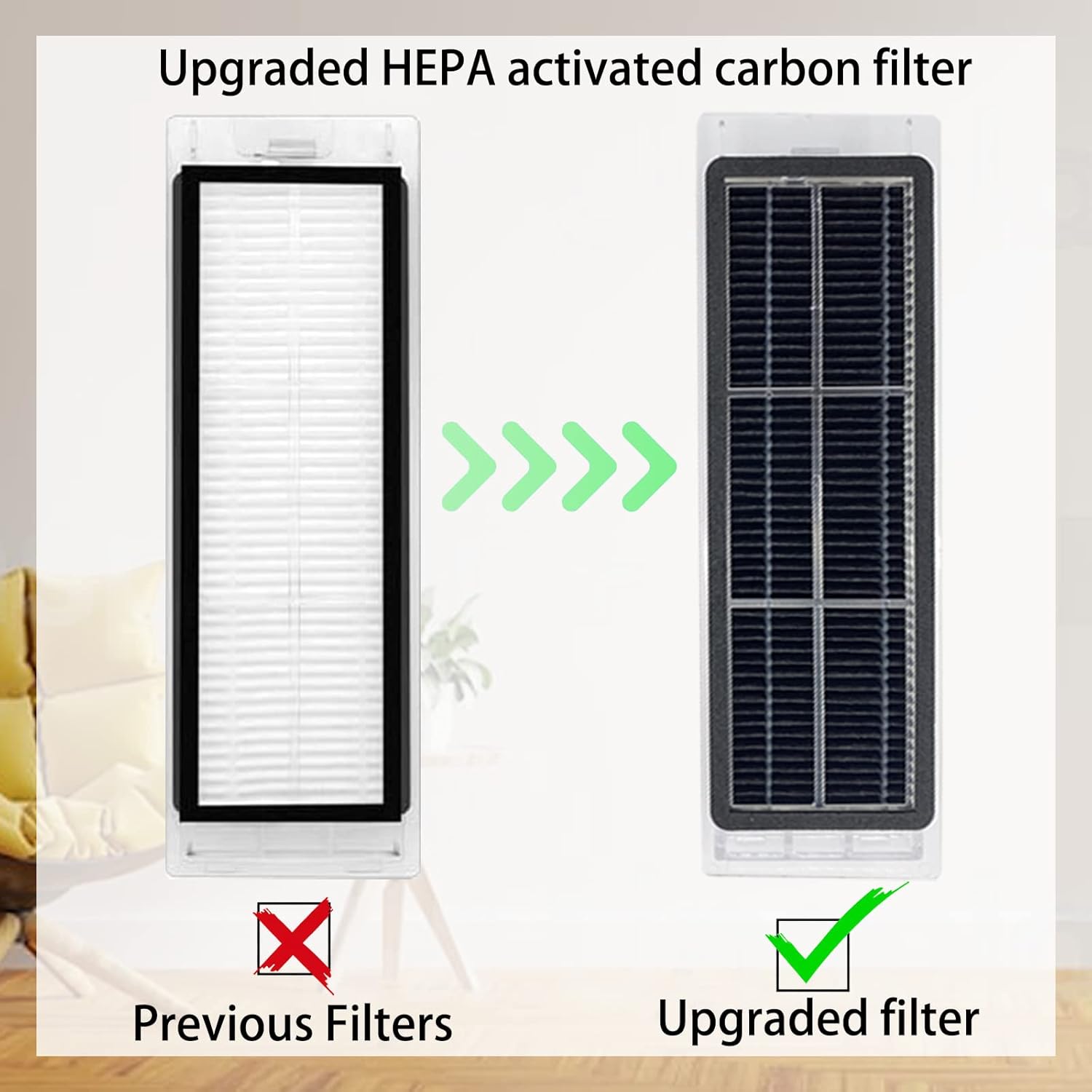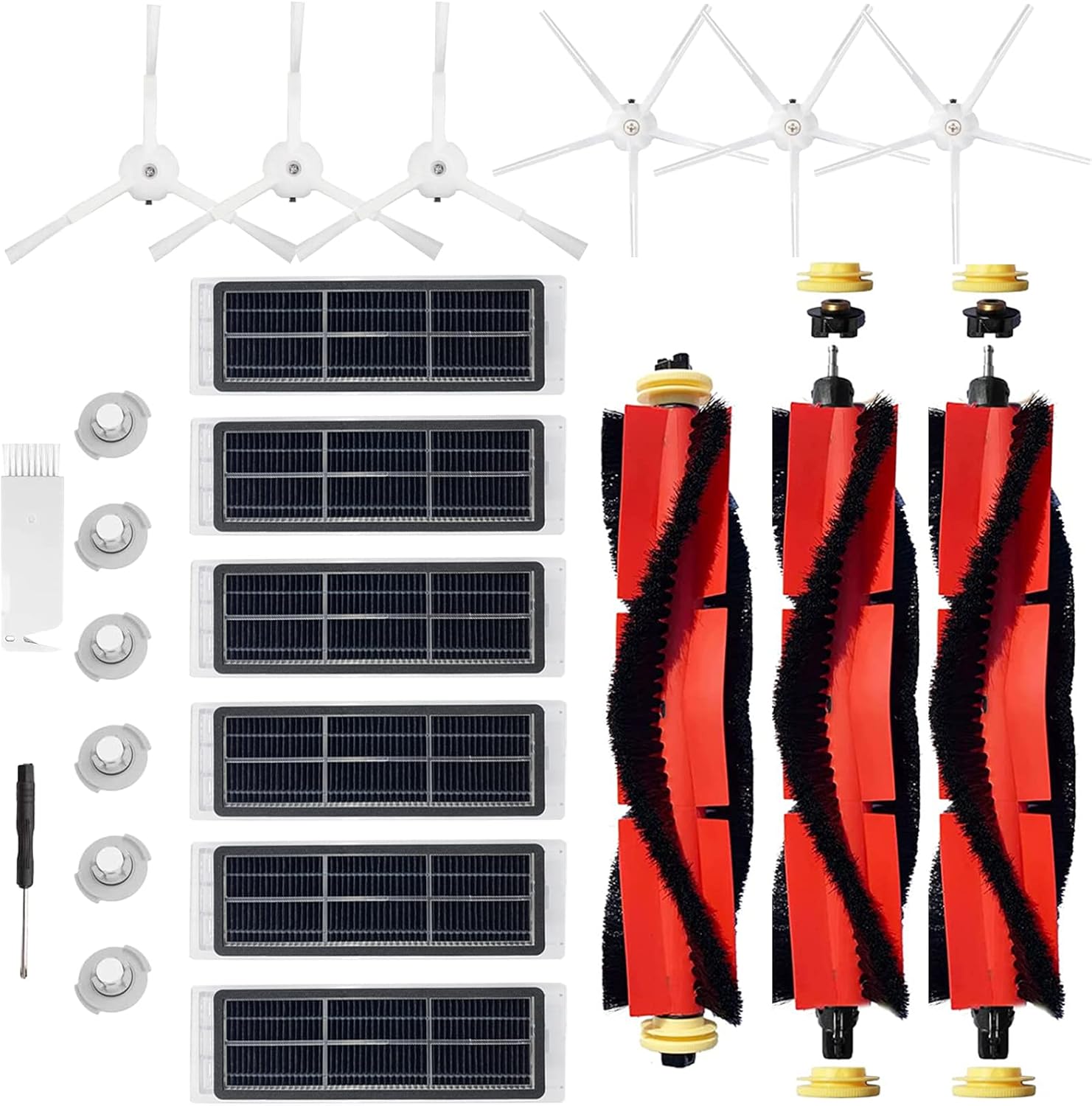 【You will get】roborock e4 replacement parts includes 3 main brushes, 6 high efficiency activated carbon filters, 6 side brushes, 6 tank filters, 1 cleaning tool brush, and a replacement screwdriver.