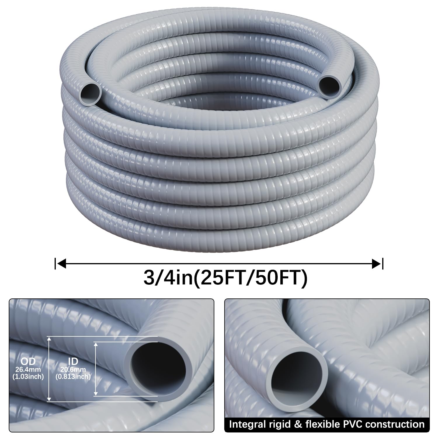 Premium Liquid-Tight Conduit: 3/4 inch Liquid Tight Conduit, Length 50′, OD:1.03 inch, Thick: 3 mm, This conduit offers ample space to accommodate multiple wires, allowing for easy and efficient wiring connections. Whether you are setting up outdoor lighting, security systems, or any other electrical project, this conduit is the perfect choice.