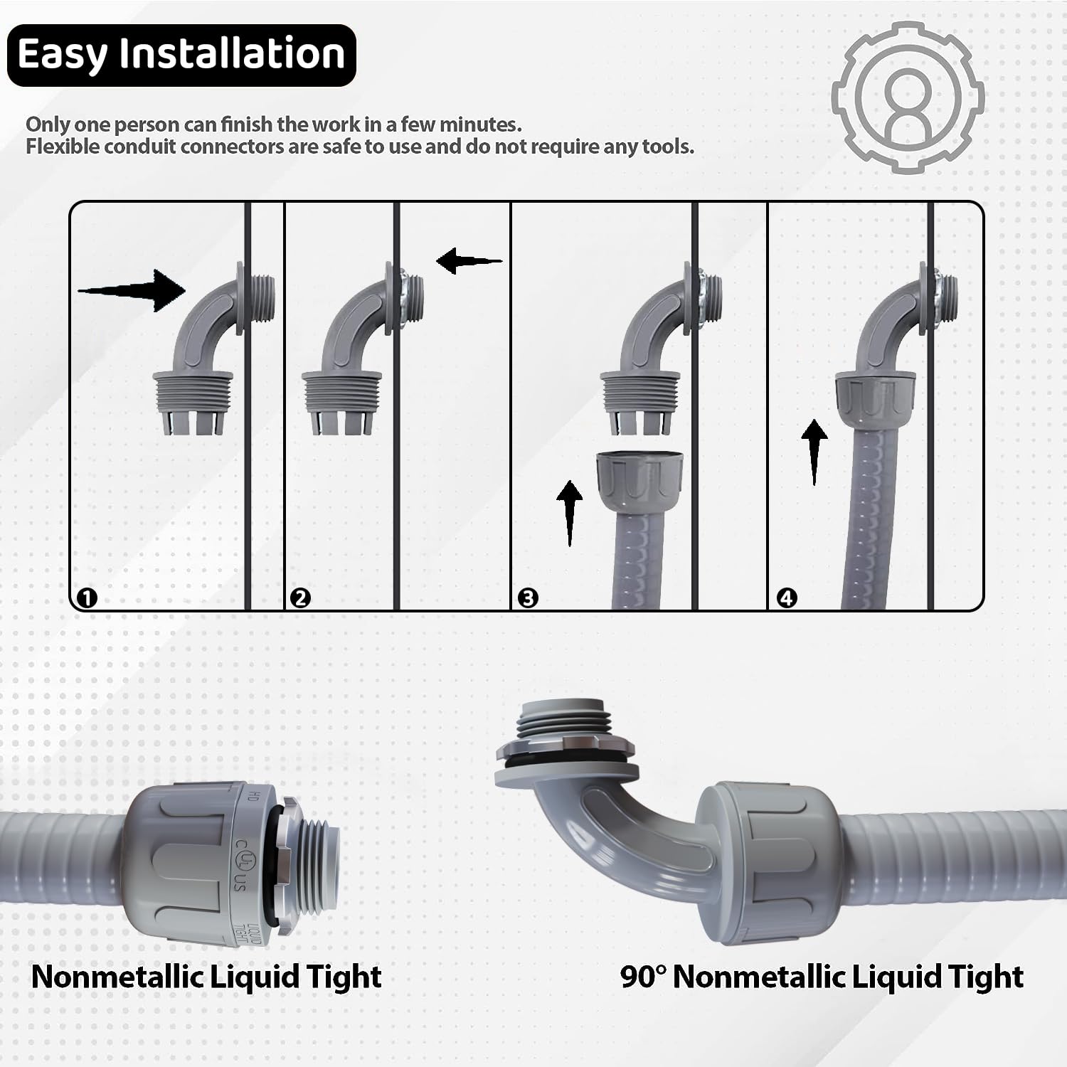 Easy Installation Only one person can finish the work in a few minutes. Flexible conduit connectors are safe to use and do not require any tools. The dome seal nut can be tightened by simply pushing the conduit or pipe onto the ferrule.