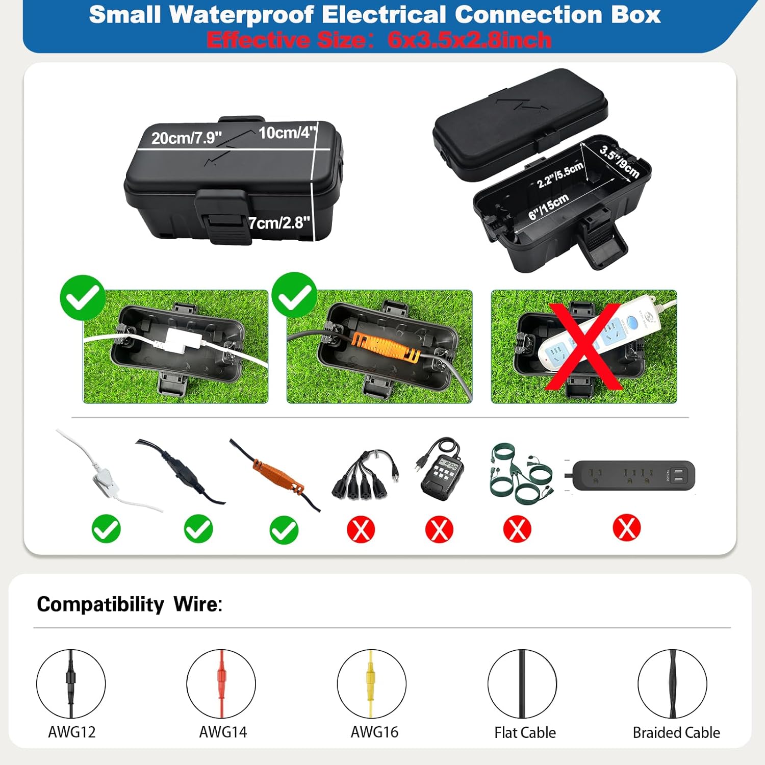 Effectively protects outdoor & indoor wire connections. Small size (6 x 3.5 x 2.8 inches) and 2 cable ports to protect plug, extension cord connector, timers, extension cords,Christmas lights, garden lights.