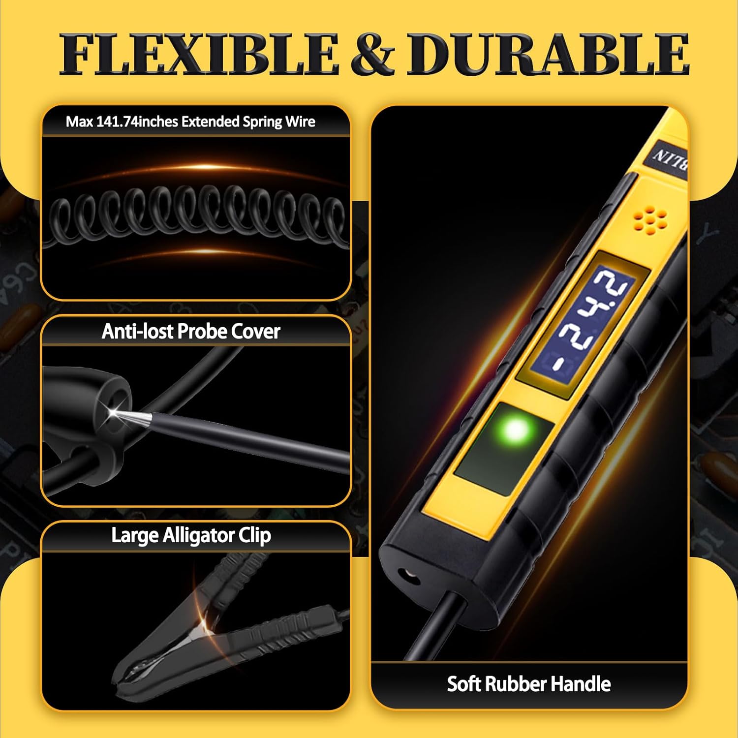 EXTENDED SPRING WIRE & ANTI-LOST PROBE COVER: Compared with the ordinary wire, the automotive light tester comes with high quality spring wire that can stretch up to 141.74 inches, making the maintenance and diagnosis work more portable, convenient and fast. It allows you to test from the front of the car to the rear without constantly searching for a suitable ground. In addition, the integrated design of the anti-loss cover ensures no puncture wounds, no matter where you go will not be lost.