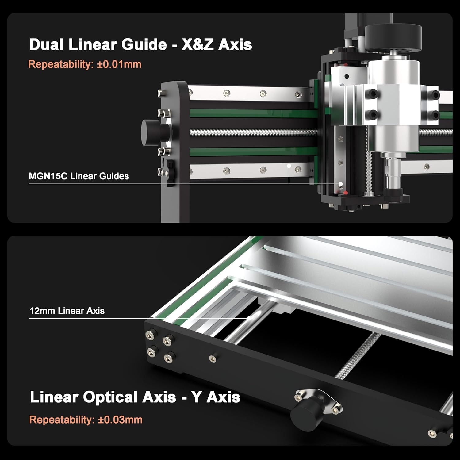 【High Precision & Low Noise】The CNC Machine’s X-axis & Z-axis feature dual steel linear guide rails, ensuring stability and preventing tilting and shaking. The Anti-Backlash Nut Block of 3020-Evo offers high precision, zero repeatability, and adjustable gaps, eliminating hysteresis and metal friction noise between the copper nut & screw rod.