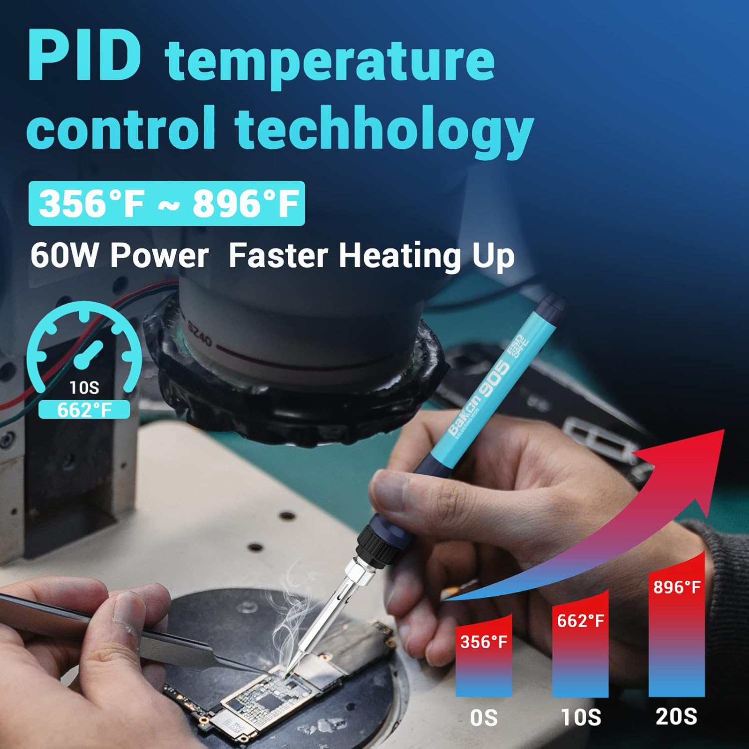 【Fast Heating & PID Temperature Control】BAKON Soldering iron station uses a high power ceramic heating core,paired with rapid heat system, reach the melting point 662℉ in just 10 seconds. Fast heating up,no long heating process before using.You can set your desired temperature from 180°C~480°C (356°F~896F°). with the high-end precision PID program, the soldering kit for electronics can monitor and correct the actual temperatures at high speed to provide the accuracy that your projects ask for.