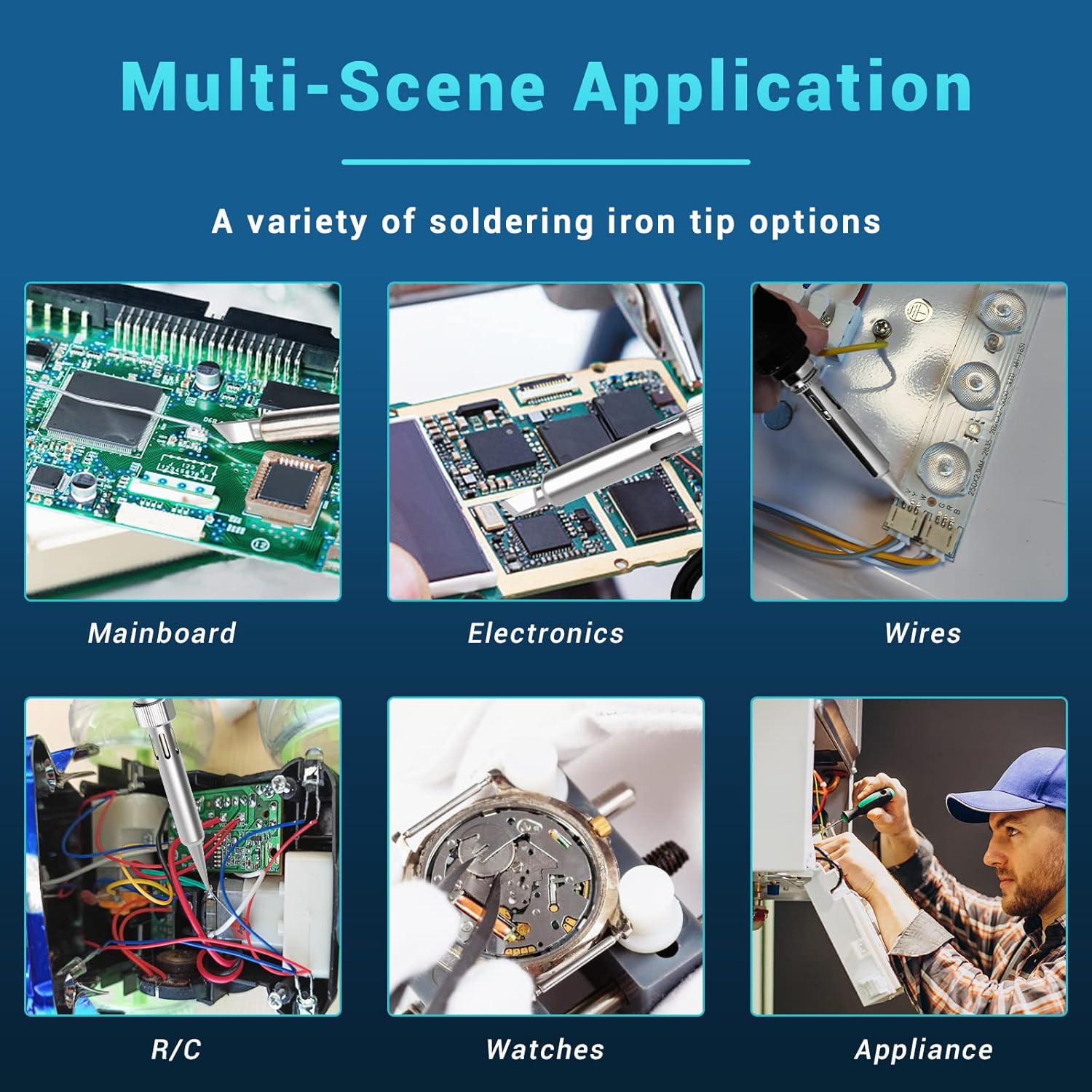 【ESD safe &Short Circuit Protection】 As a professional manufacturer of hardware instruments, we know the importance of safety.The soldering iron station is equipped with high temperature resistant silicone wire, anti-static design, ESD safety, making the soldering iron kit safer and more efficient.The soldering station also provides heating core short-circuit protection. When the heating element and sensor are abnormally short-circuited, the machine will automatically alarm and remind you.