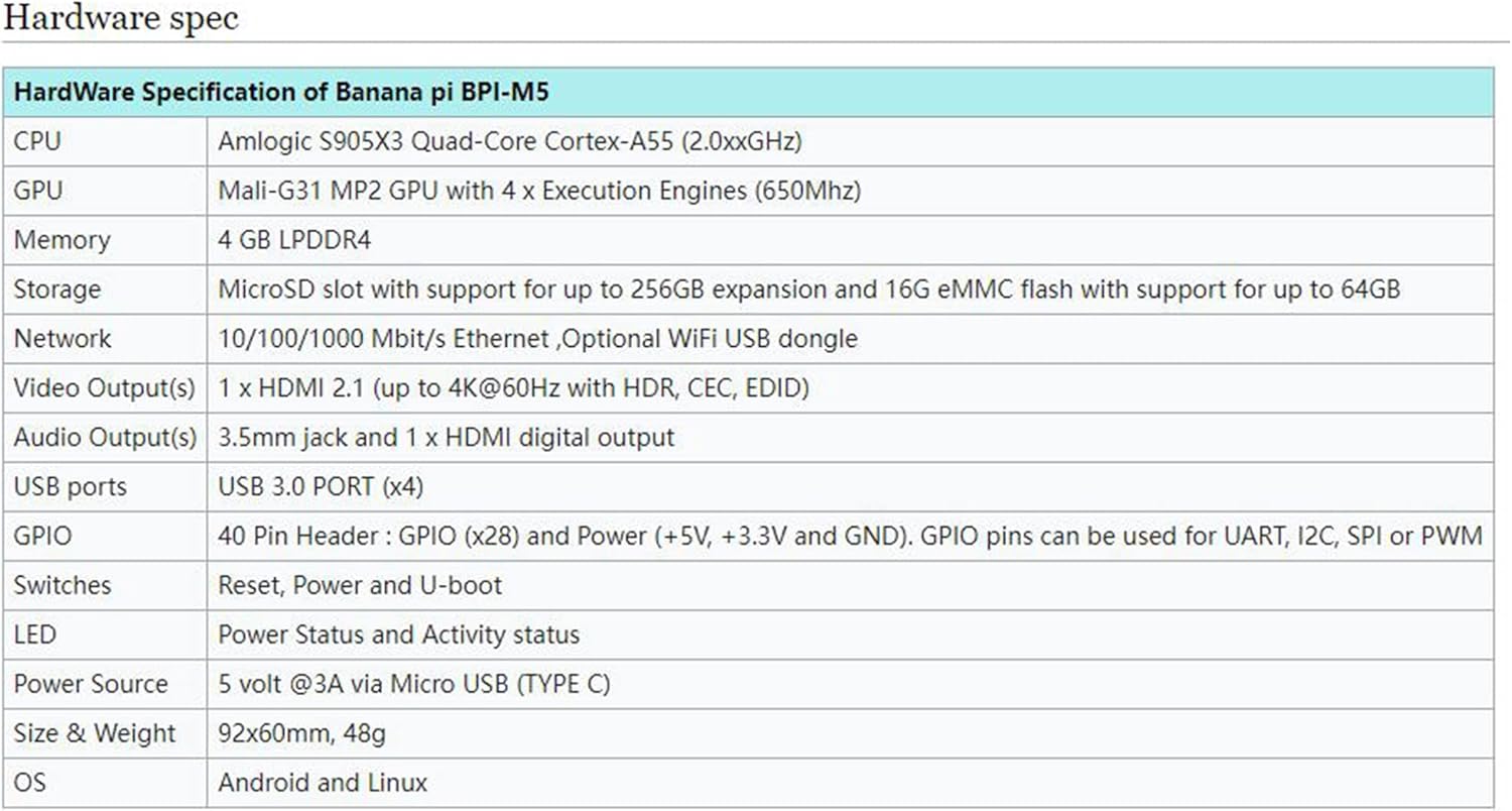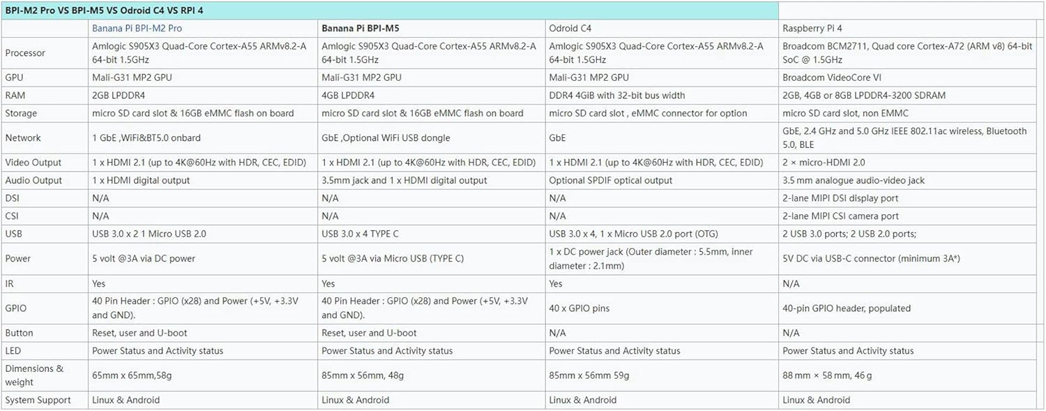 Comparison Table of Hardware Specifications between BPI-M5 and Odroid C4 and Raspberry Pi 4