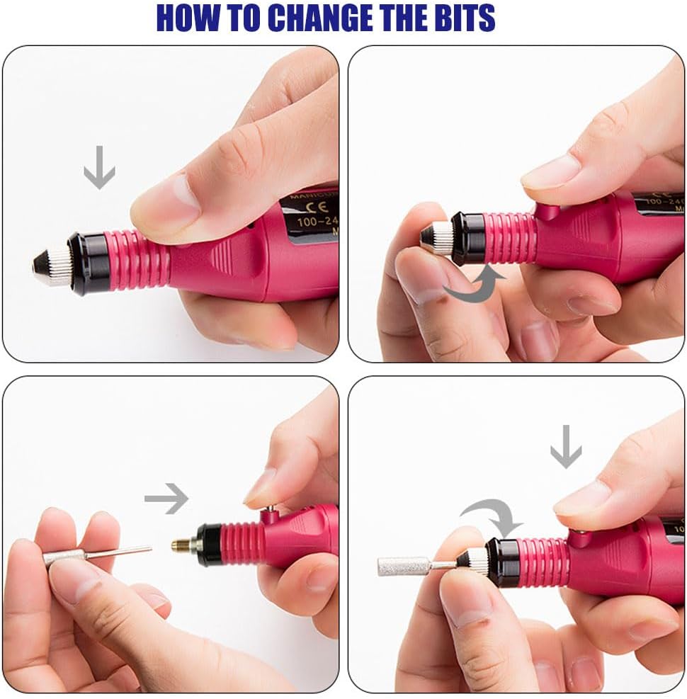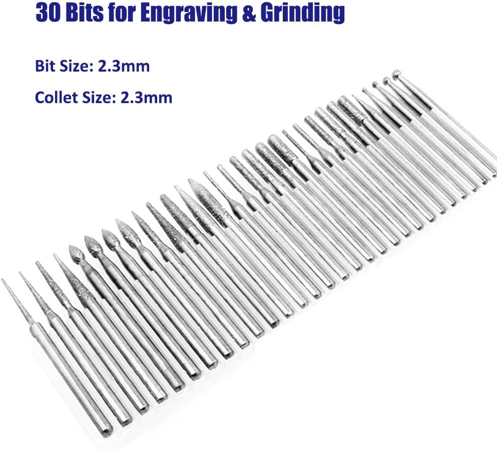 【Total 30 Bits & 8 Stencils】Includes 2 Collets (2.3mm), 10 pointed bits, 5 round bits, 4 jujube-shaped bits, 11 flat bits; 4 graphic stencils, and 4 letter / number stencils.