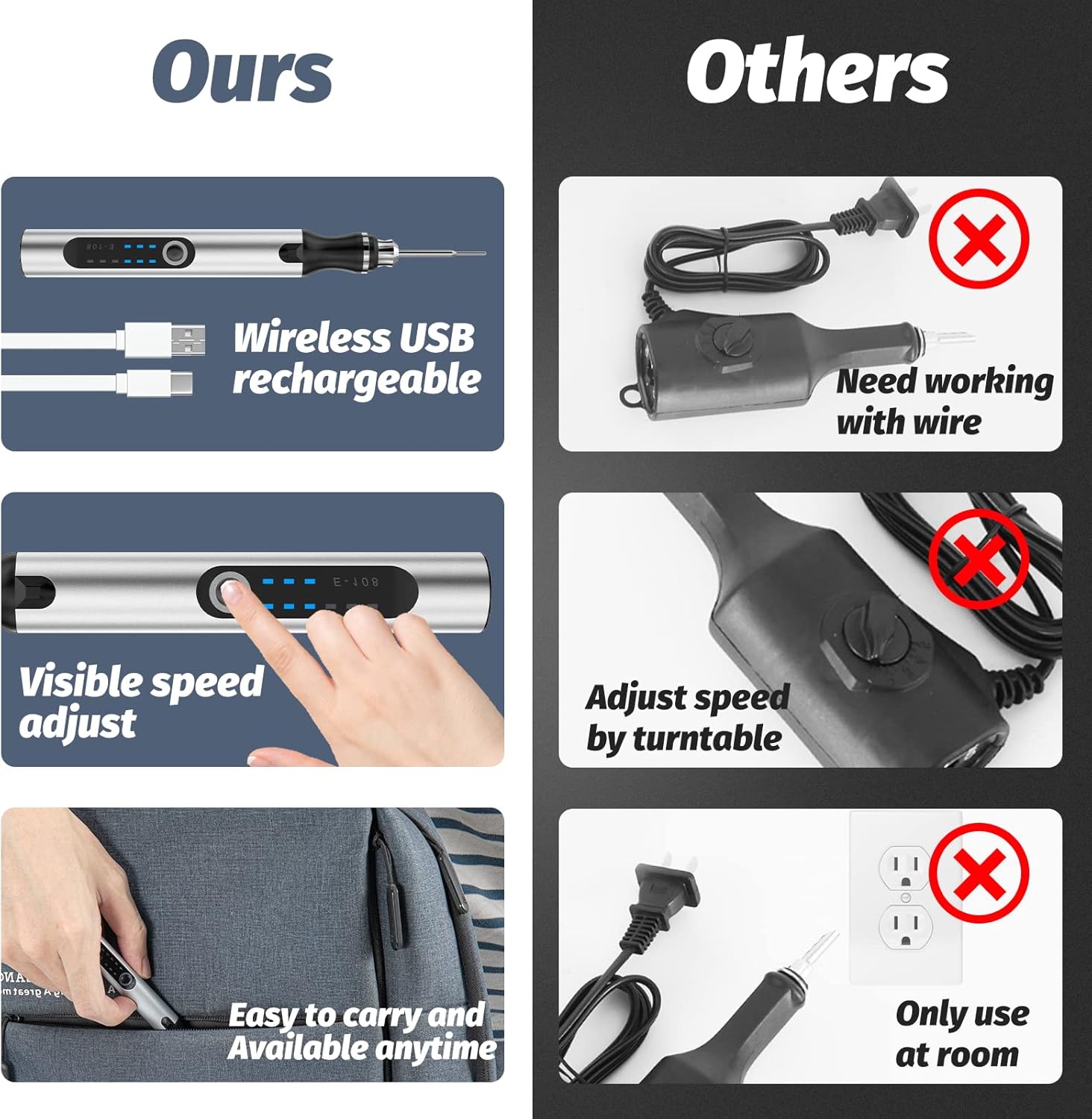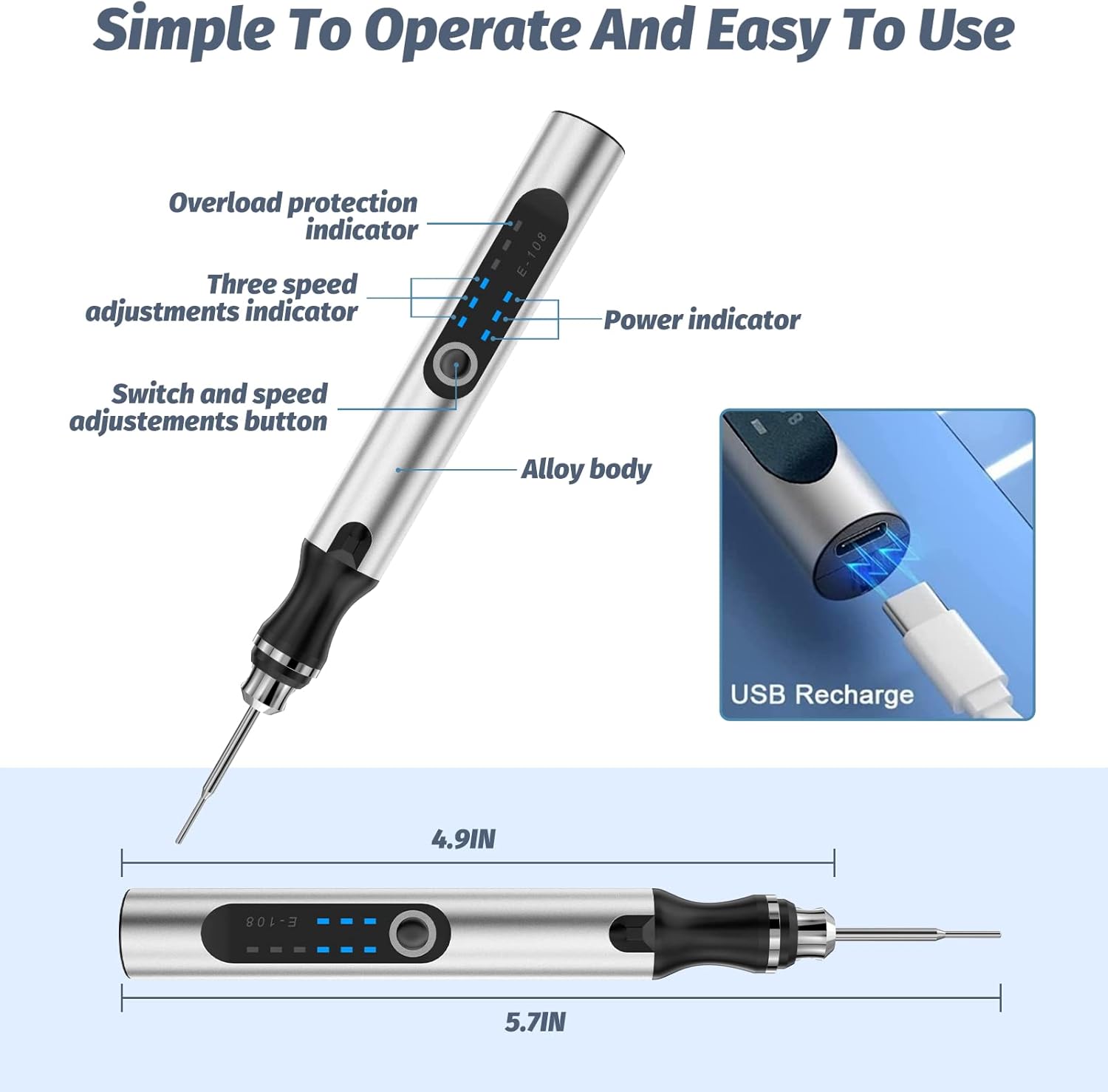 USB WIRELESS ENGRAVER: These engraving tools are equipped with Lithium battery and rechargeable by USB interface. Cordless use will be up to 30 minutes idling after full charge. Easy to help you finish better engraved craft. 3 kinds of speed can be adjusted. The lowest speed will let you polish your nails safely. The highest speed is also working on metal carving