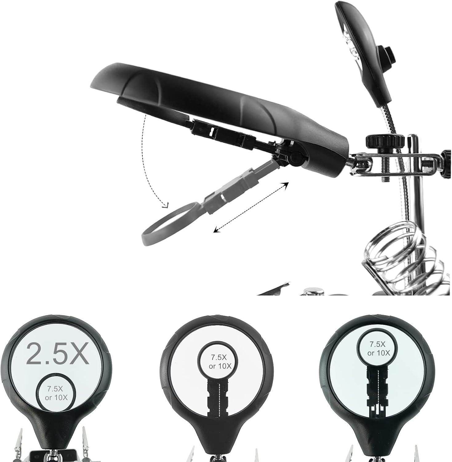 🔍[ Multiple High-definition Magnifier ] :The desktop magnifier with light has a main magnifier and two auxiliary lenses: 2.5X 90mm, 7.5X 34mm, and 10X 34mm. The magnifying glass is very flexible and can rotate 360 degrees.The 2.5X main magnifier is made of real glass , so you don’t need to worry about melting and fogging issues like plastic usually does.Different magnifications can be selected during operation to increase the field of view. a good aid for fine work on small projects.