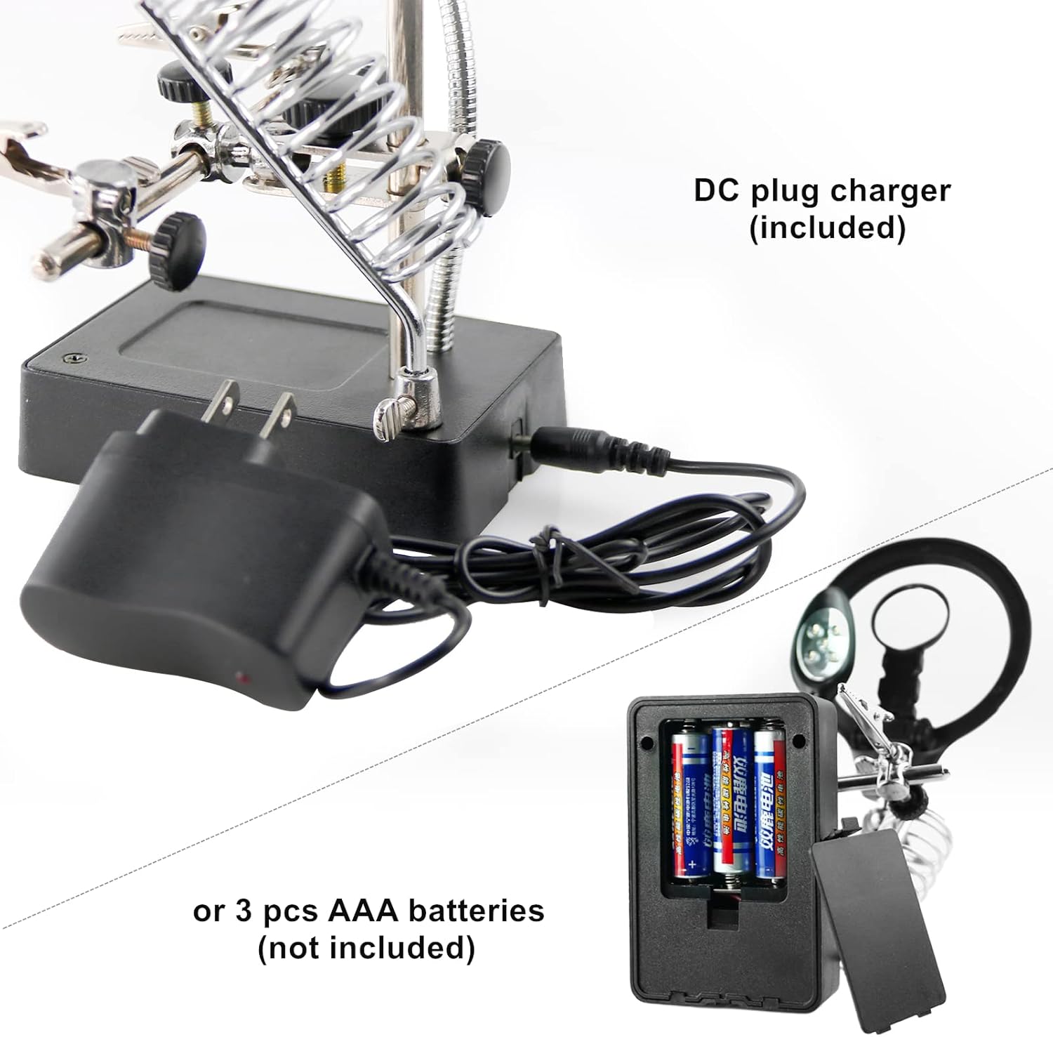 🔍[ Stable Base ] :The battery compartment at the bottom of the soldering iron stand magnifying glass magnifier is equipped with steel plates to increase the basis weight and enhance the stability. which is perfect for electricians, jewelers, DIY hand-made enthusiasts, and modelers who work with solder or small details with no worries about tilting or moving the soldering tool. Please place it on a flat table.Power by DC plug power(included) or 3 pcs AAA batteries (not included)