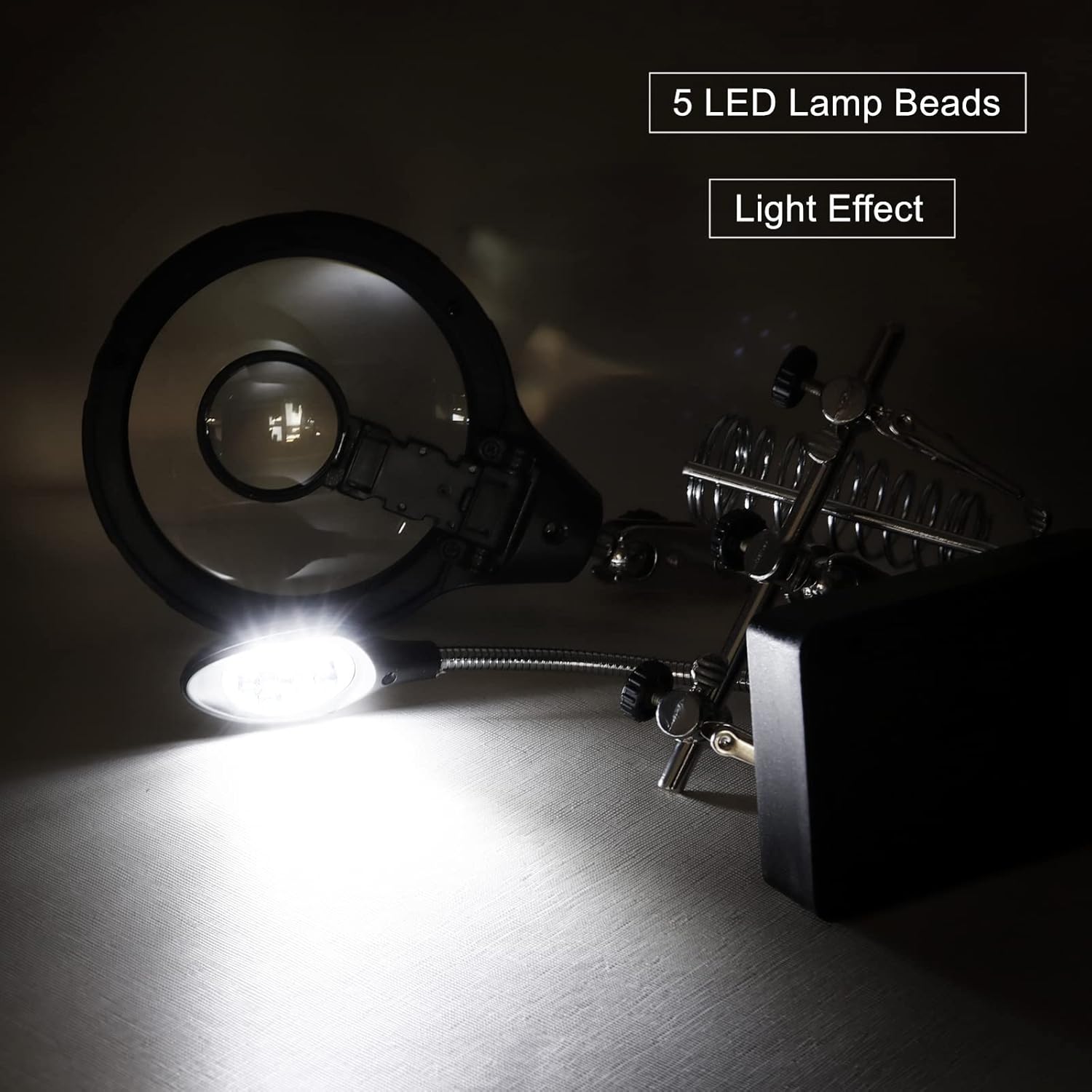 🔍[ Bright LED light ] :This magnifying glass with light and stand is composed of 5 LEDs to form a bright and intense radiance. Adjust the light distance and light angle freely, it illuminates your work area easily. This magnifying glass with light and solder station is multi-functional to be used as a desk lamp alone as well.It is bright enough and has a very wide radiation range.