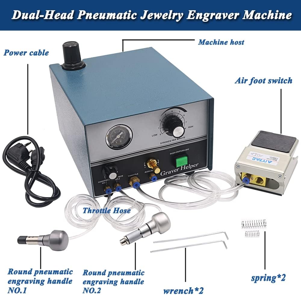 【Various Application】The pneumatic engraving machine fulfills the need for a machine capable of allowing rapid but precise cutting and carving of metal, stone, wood, and many other materials. The precise impact control feature of the machine also makes it an ideal tool for stone setting, stippling, matte finishing on jewelry, stipple engraving on crystals, etc.