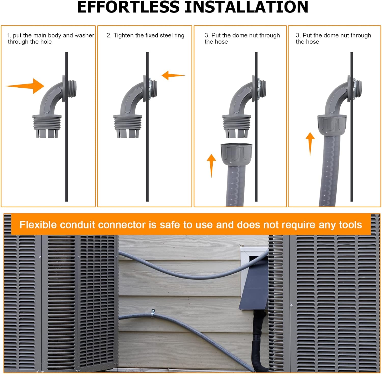 【Effortless Installation】-The Liquid-Tight Conduit Fits is fast, and only one person can complete the work in a few minutes. flexible conduit connector is safe to use and does not require any tools. you can simply tighten the dome sealing nut by pushing the conduit or pipe onto the ferrule