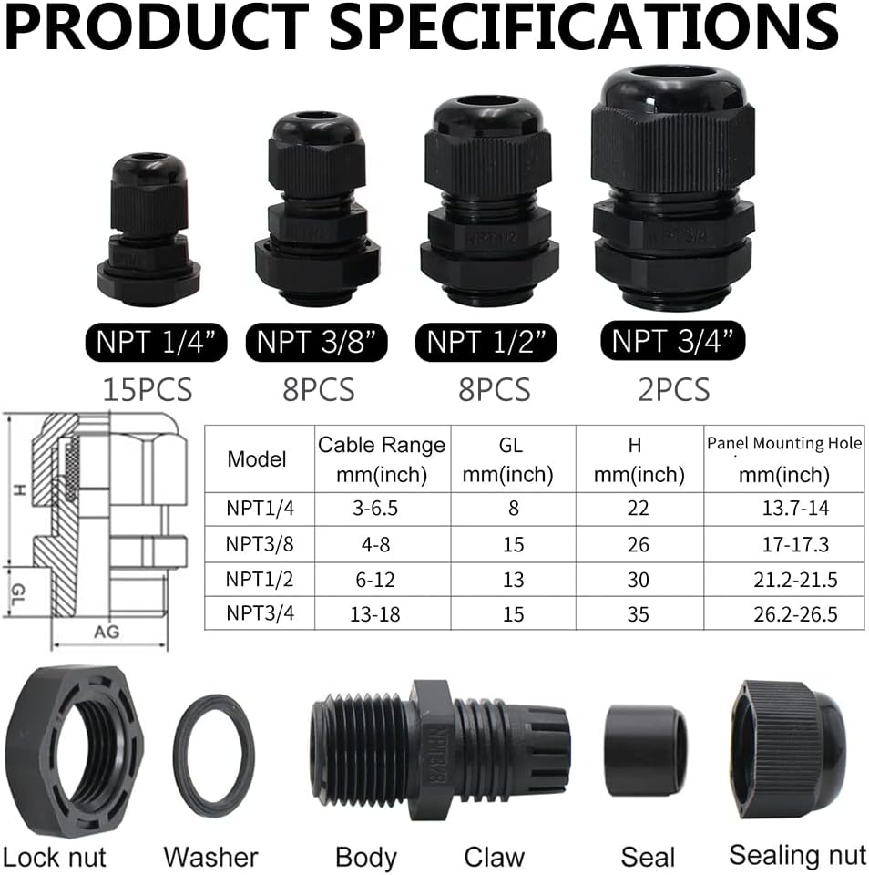 Cable Gland Black Good designs — Wide clamping range with strong durable stretching resistance, cause no damage to cables or devices.Each strain relief cable gland connectors comes with a high quality rubber washer to ensure it remains watertight to the maximum.
