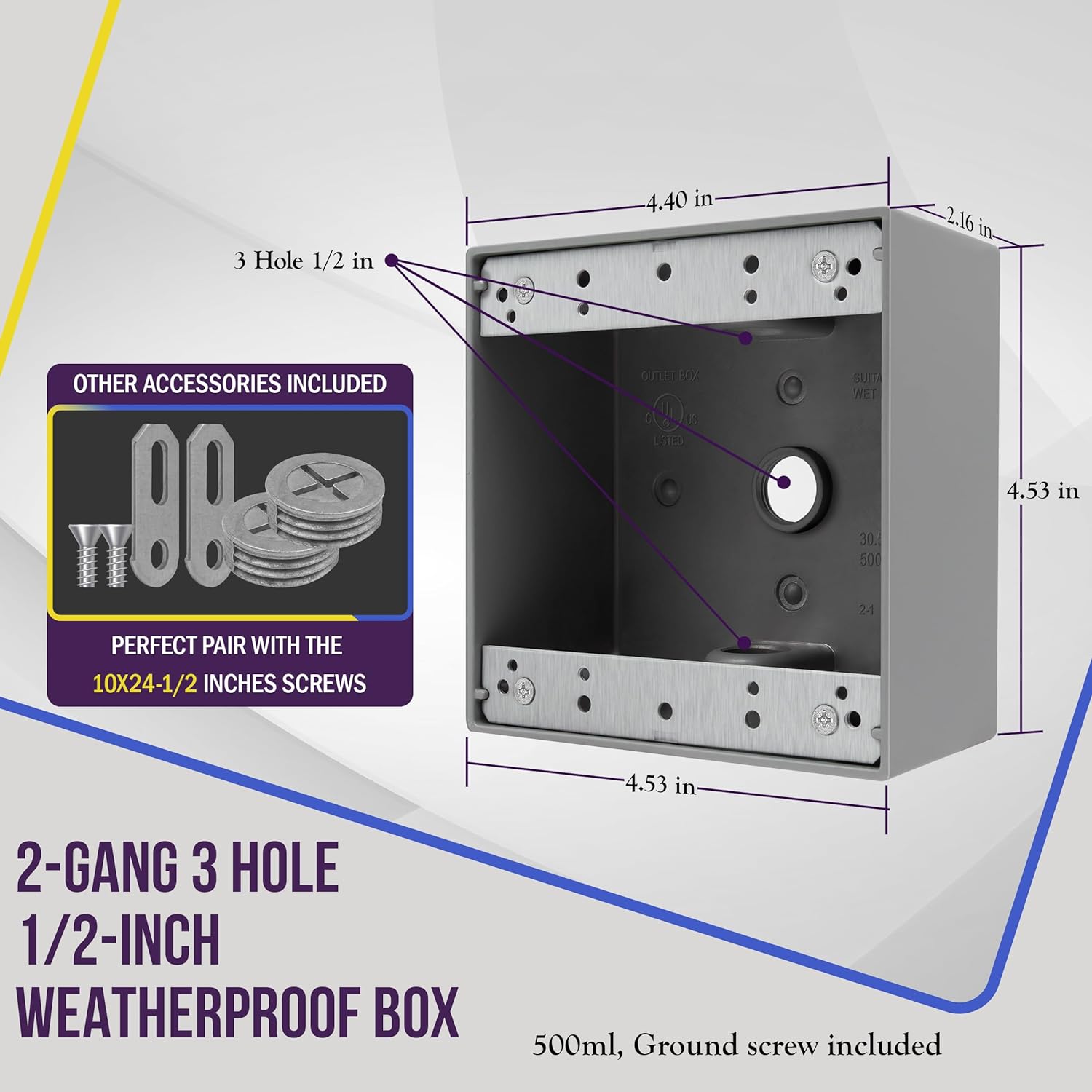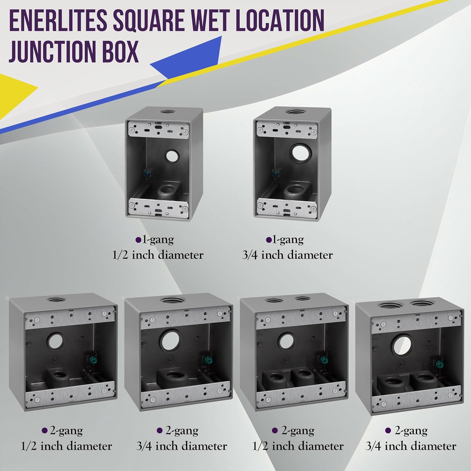 The ENERLITES 2350 weatherproof outlet box is a double-gang electrical box that features three 1/2-inch diameter knockouts. This 2-gang outlet box is designed specifically for installing switches and receptacles in moisture-prone or outdoor locations. The electrical box features a die-cast metal construction that seals out moisture, dust, debris, and insects to keep receptacles protected year-round and throughout any weather conditions. The gray-colored junction box is also powder coated for maximum scratch and corrosion resistance. This 2-gang weatherproof box is compatible with standard toggle switches, duplex receptacles, decorator switches/receptacles, and GFCI receptacles. The junction box is compatible with 2-gang weatherproof covers, such as ENERLITES models IUC2V-D or 7702-WP (wall plates sold separately). The outdoor outlet box comes with a pre-installed grounding screw, closure plugs, mounting lugs, and installation screws to make installation as fast and easy and possible. This product is UL & CUL listed and complies with NEC 2017 406.9 for a weatherproof enclosure in damp locations..