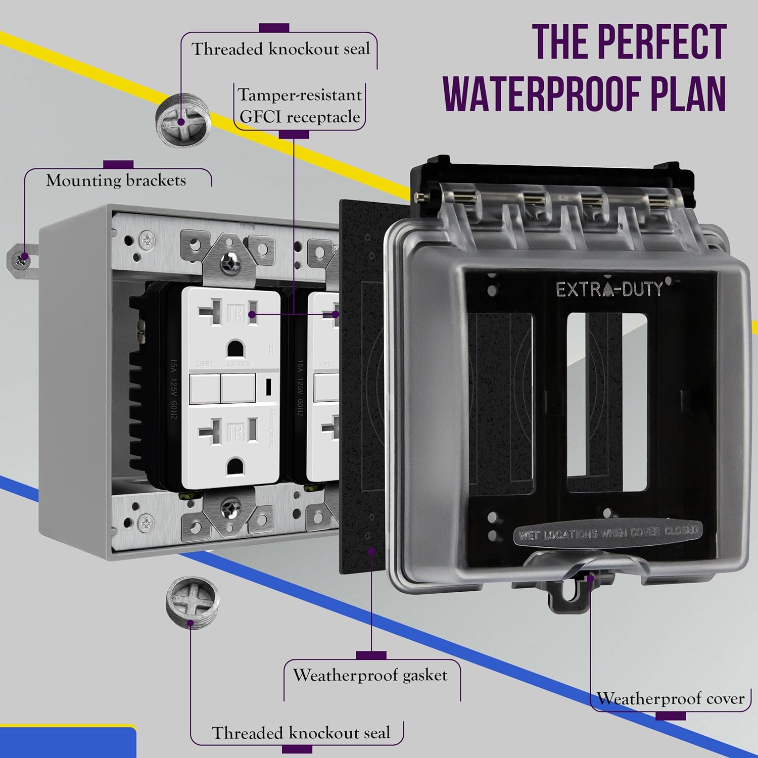 Die-cast metal construction effectively seals out moisture, dust, debris, and insects to protect outdoor receptacles