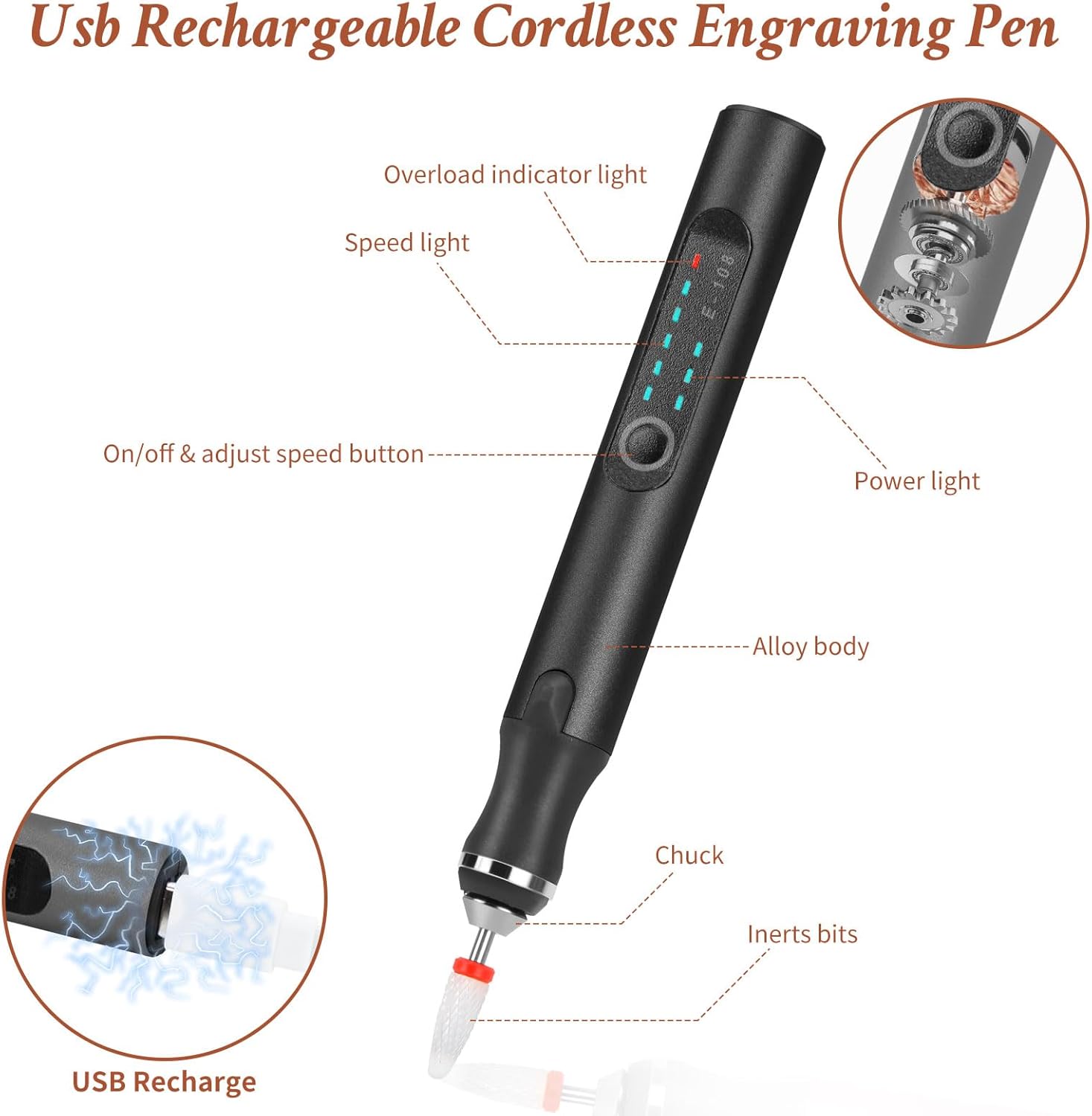 Engraving Pen with 37 Bits, USB Rechargeable Cordless Etching Engraving Tool, Portable DIY Rotary Engraver for Jewelry Wood Glass Stone Carving