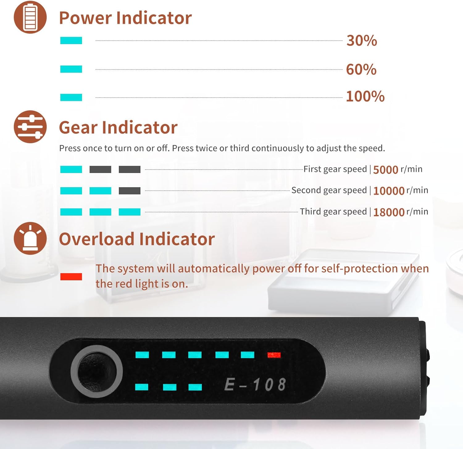3-Speed Adjustable Operation: The Kaibced cordless engraving pen delivers a rotational speed of up to 18,000 RPM, featuring three preset modes (selected via short press) to handle various materials. Designed with an ergonomic and lightweight body, it ensures precise control and detailed engraving.