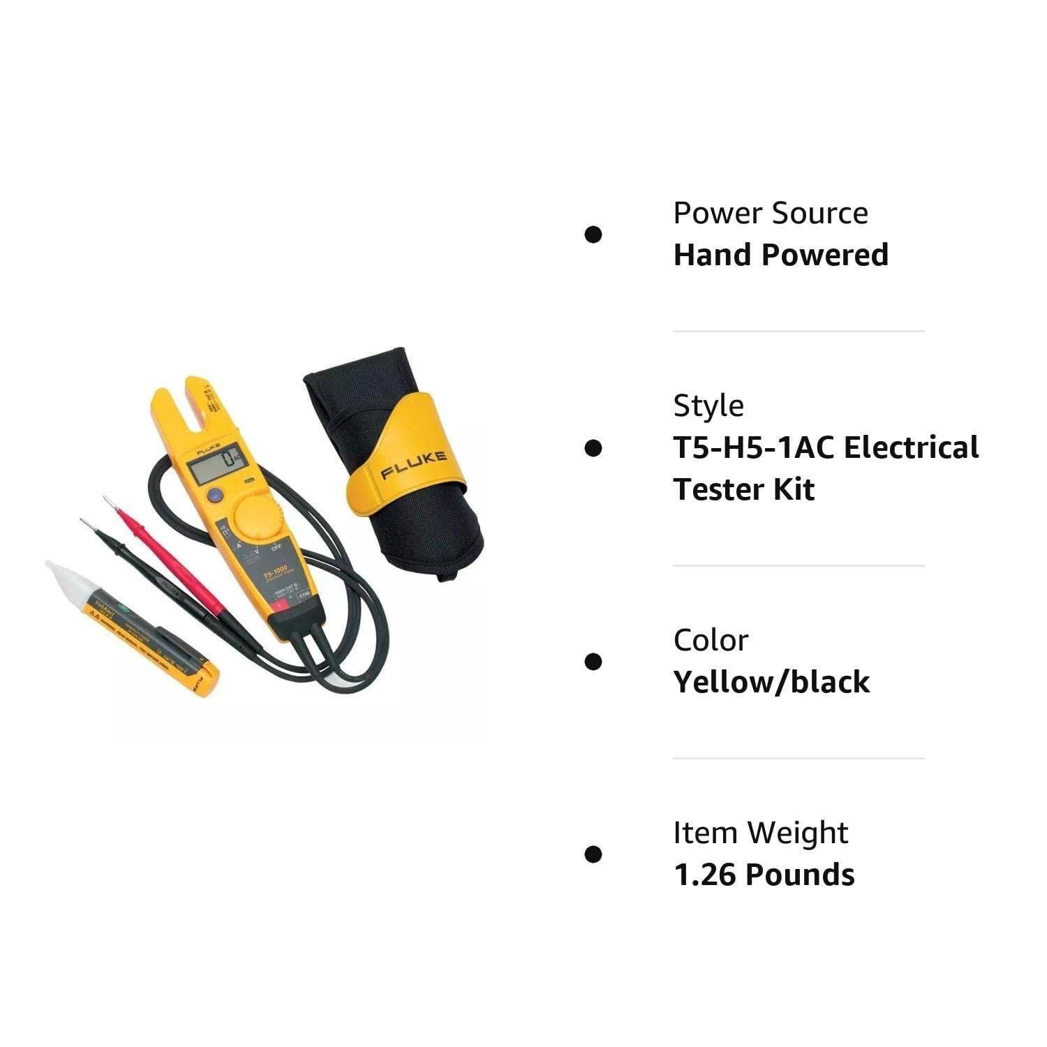 3 piece kit with a voltage, continuity, and current tester (fluke t5 1000); A non contact voltage detector (fluke 1AC II) and a holster