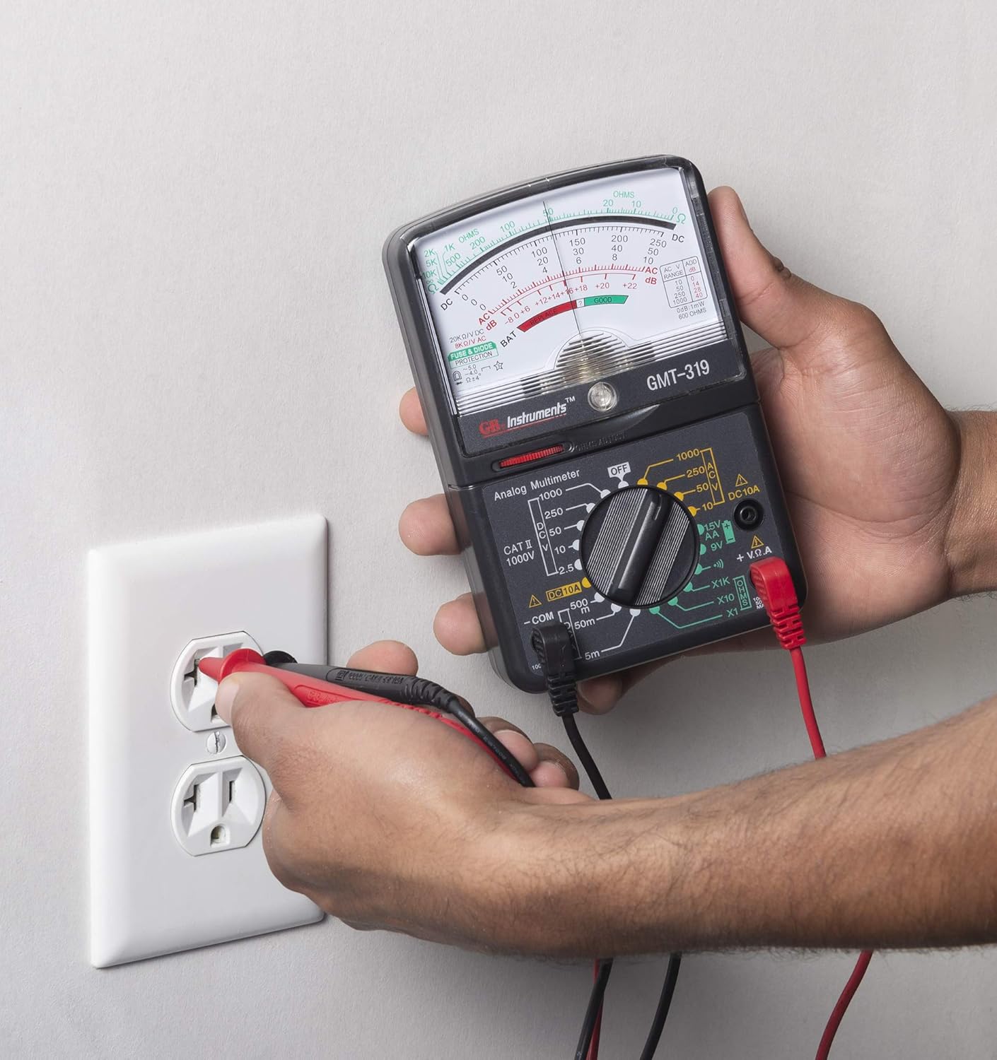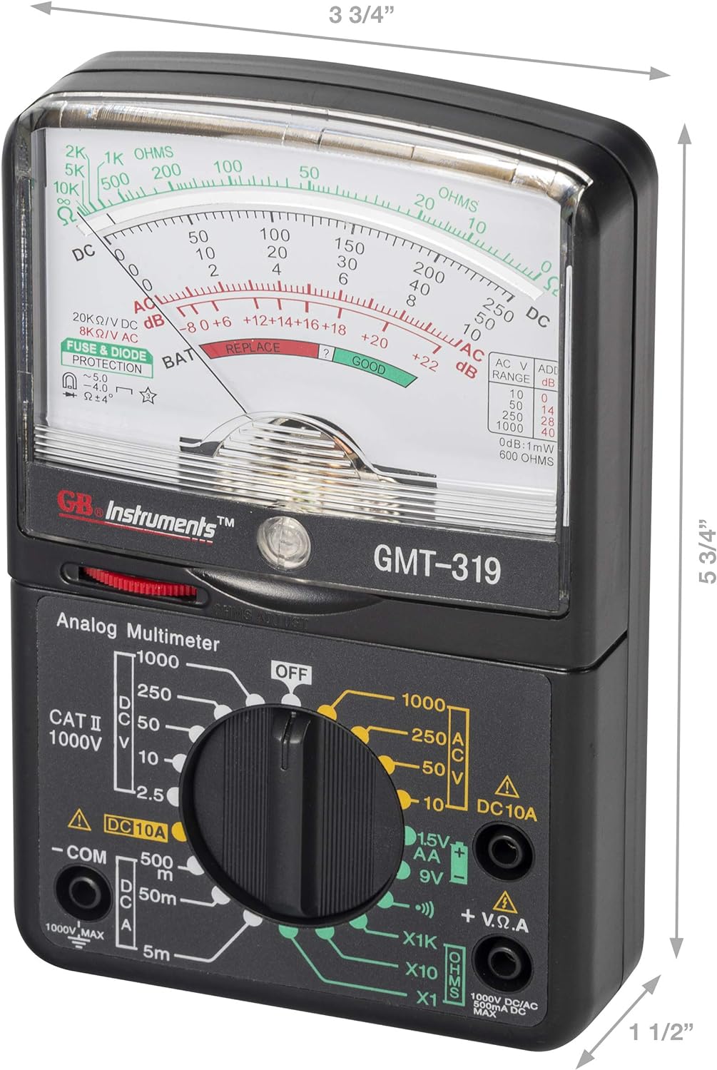 Capable of measuring 7 functions with 19 ranges on an easy-to-read color-coded analog display this multifunctional analog multimeter was engineered to handle electrical tests for the homeowner, hobbyist and professional alike. Unit tests DC Voltage, AC Voltage, DC Current or Amps on a separate jack (fused), Resistance, or Megohm Max and features both visual and audible continuity with buzzer sounds at less than 100 Ohms, Decibels on AC voltage ranges, and common household batteries 1.5V and 9V. Unit includes built-in Zero Ohms adjustment dial allowing you to reset prior to resistance testing and to perform internal battery test function. Incorporates fuse overload protection circuitry to protect the user and a mirror scale is provided to reduce the possibility of parallax errors. Testing household batteries for charge level, troubleshooting various low voltage circuits, testing wall receptacles for proper voltage and grounding, and troubleshooting electrical cords, strings of lights, fuses, and switches to determine if they are operating properly or if a break in the circuit exists and the item in question needs to be repaired or replaced. The decibel feature of this multimeter is used for transistor gain measurement in electronic circuits and should not be confused with audio decibels.