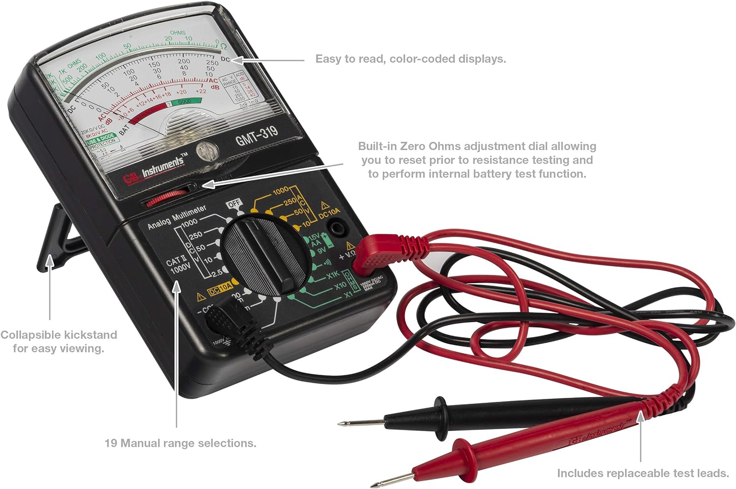 Includes replaceable test leads and operating instructions