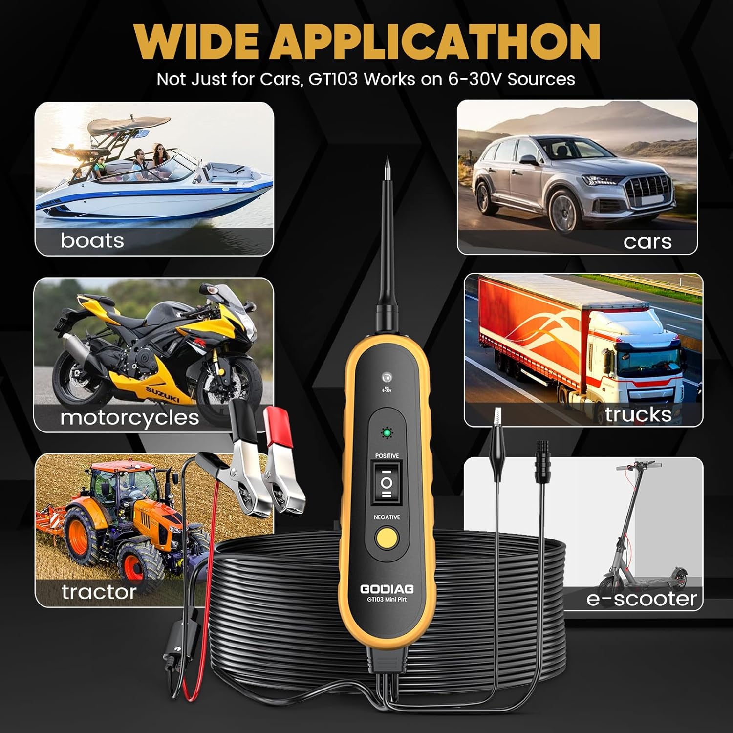 【Why Need It】With the GODIAG probe tester, you can test for continuity/polarity/voltage and ground signals/Short&Open Circuit. And most importantly, you can also use the Power Circuit Probe to check switches, relays and the on-off of diodes, fuses and circuits, activating electronic components. This probe tester can assist you in tracing problem wires and locating breaking points.
