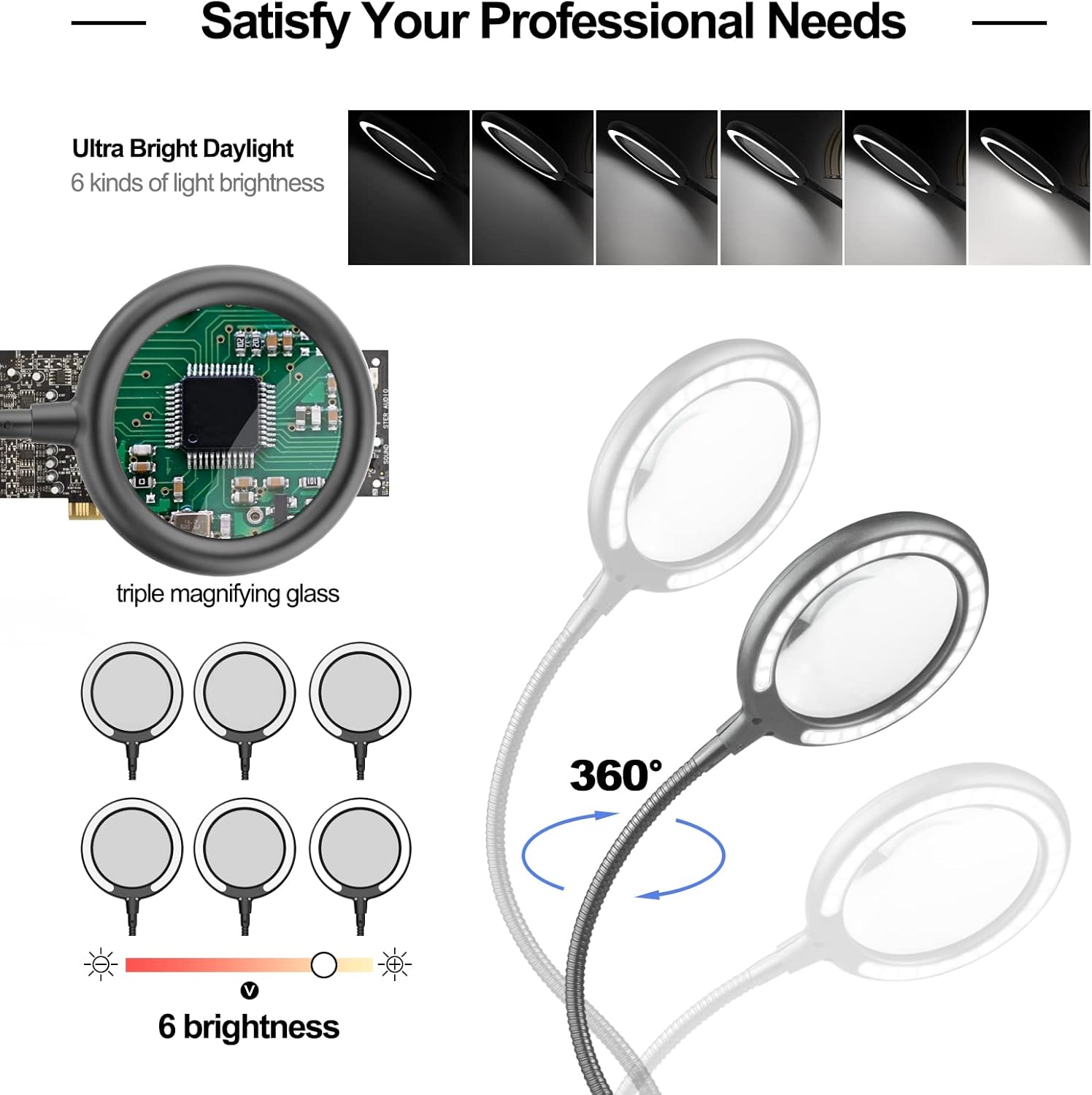 Illuminate and magnify your field of vision: The 3X dimmable magnifying lamp has 28 lamp beads with 500 lumens illuminance, which can be switched between 6 brightness levels at will. It can help you to illuminate and magnify the tiny details while you are working, so as to ensure the accuracy and accuracy of the work as much as possible