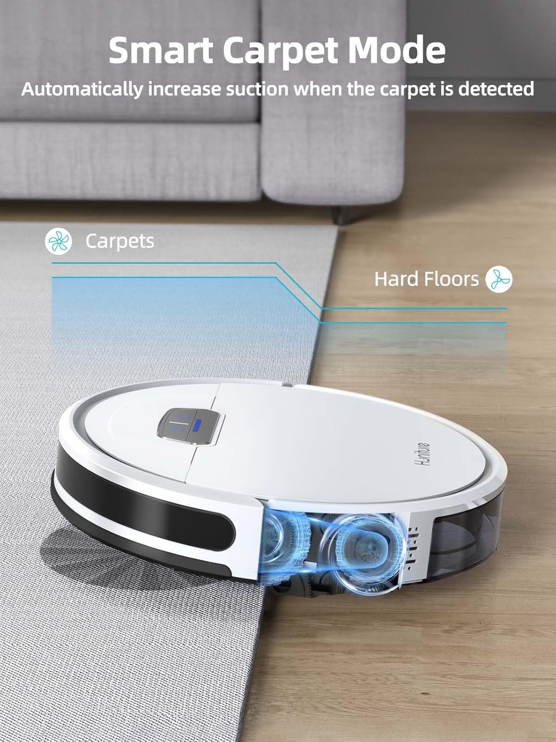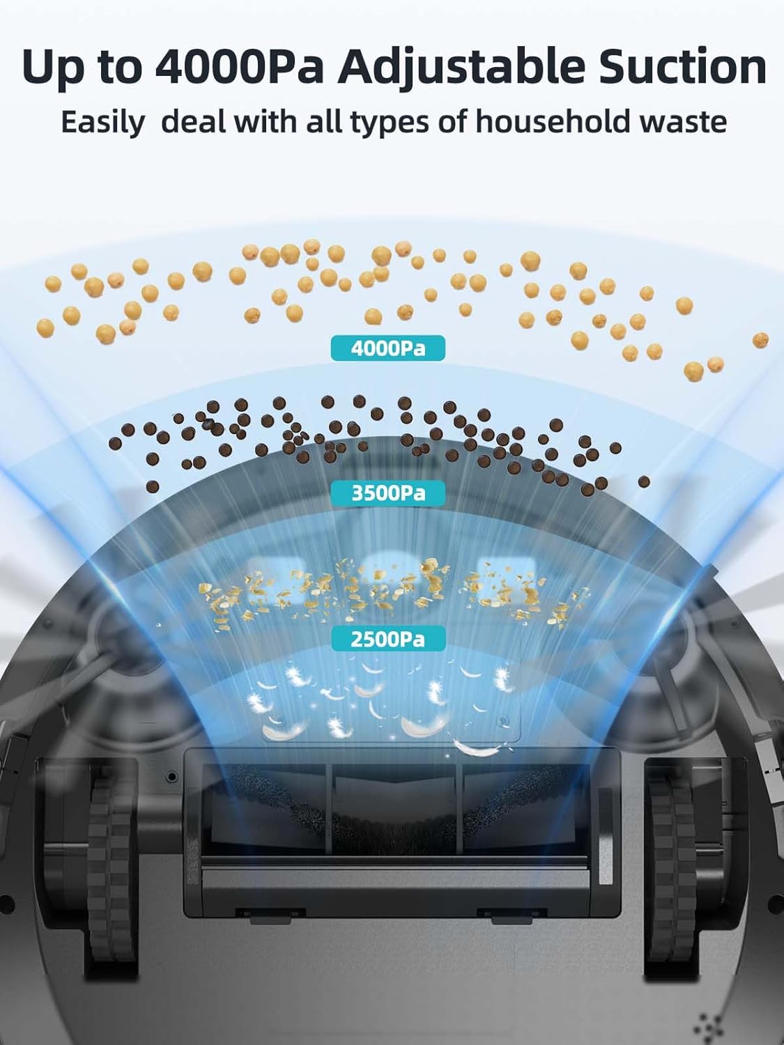 šŸŒ€ć€4000Pa Super Suction Power怑HONITURE G20 Robot Vacuum Cleaner is equipped with a Japanese NIDEC motor, which can reach 4000Pa super suction power.The Robotic Vacuum can effortlessly pick up all kinds of dirt and debris on the floor, suitable for all kinds of flooring types and carpets.