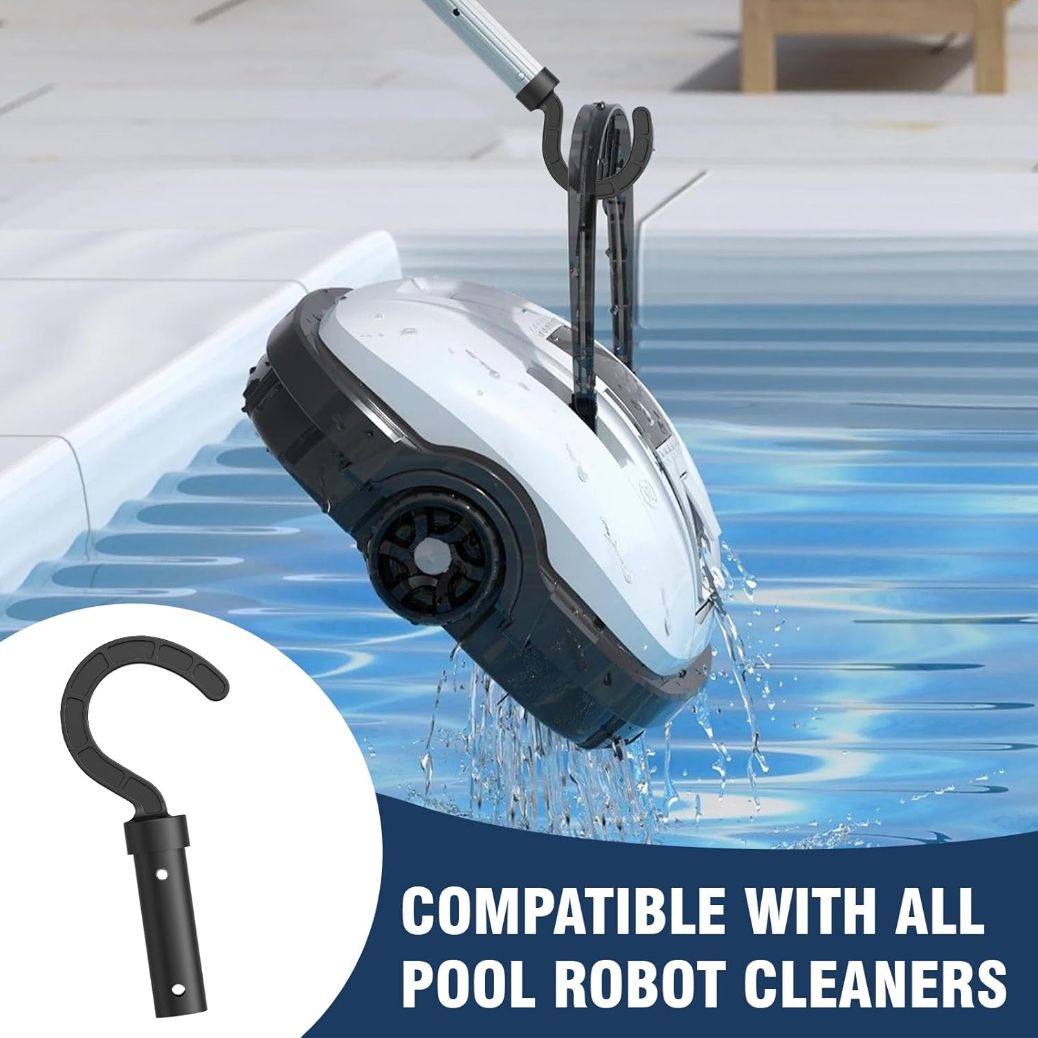 【Easy to use】Just install the hook onto any standard telescopic rod(just hang your pool pole on it also possible) and you can easily retrieve your good friend pool robot cleaner without getting wet.