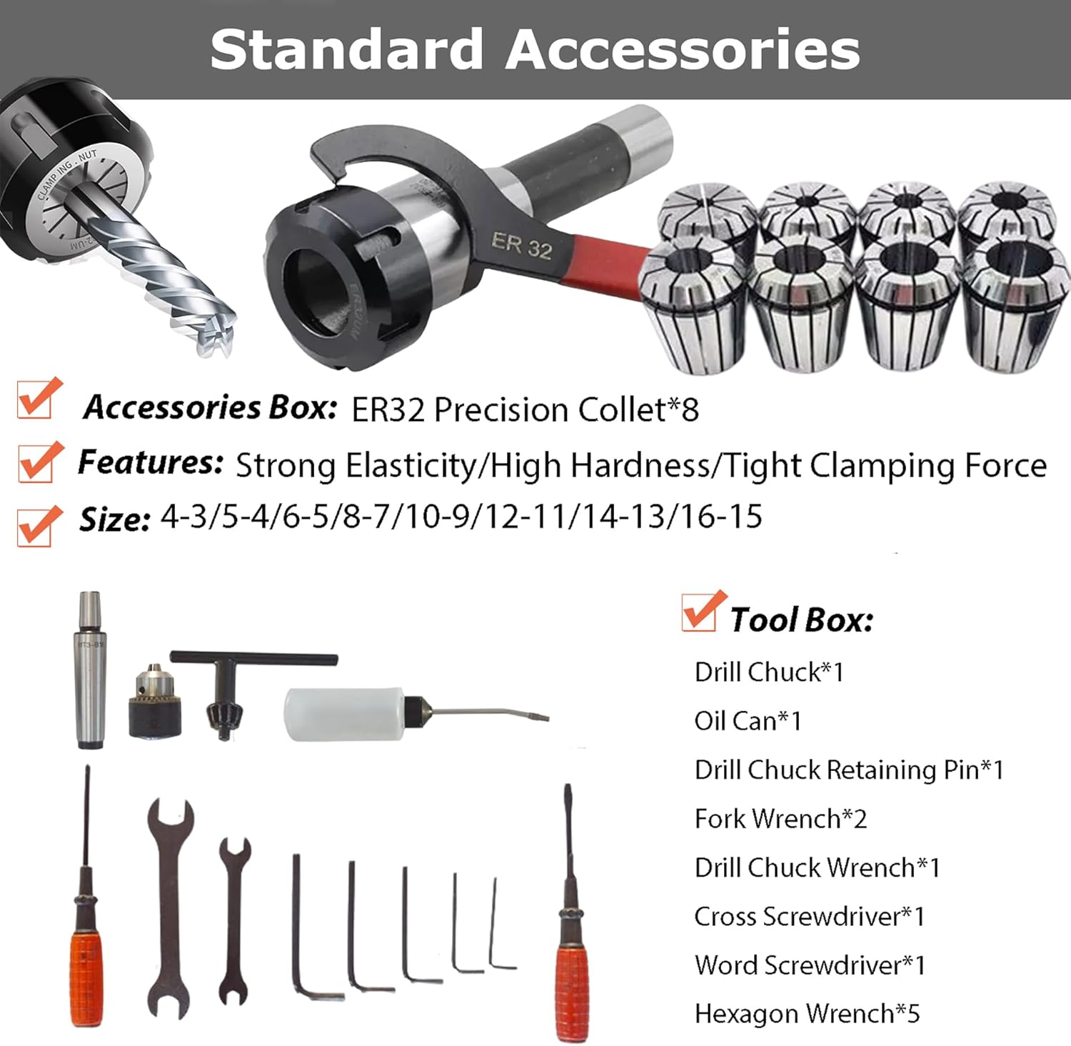 ๐ใ๐๐ข๐ญ๐ก ๐๐-๐๐๐๐ ๐๐ซ๐ข๐ฅ๐ฅ ๐๐ก๐ฎ๐๐ค๐ฌใThe milling lathe has a R8 metric thread,making it suitable for both industrial and hobby use.It comes with a set of high precision R8-ER32 milling chucks,eliminating the need for additional purchases.The chucks come in various sizes:4-3/5-4/6-5/8-7/10-9/12-11/14-13/16-15 to meet different needs.IF YOU NEED ANY PARTS,PLEASE SEND AMAZON MESSAGE TO US.