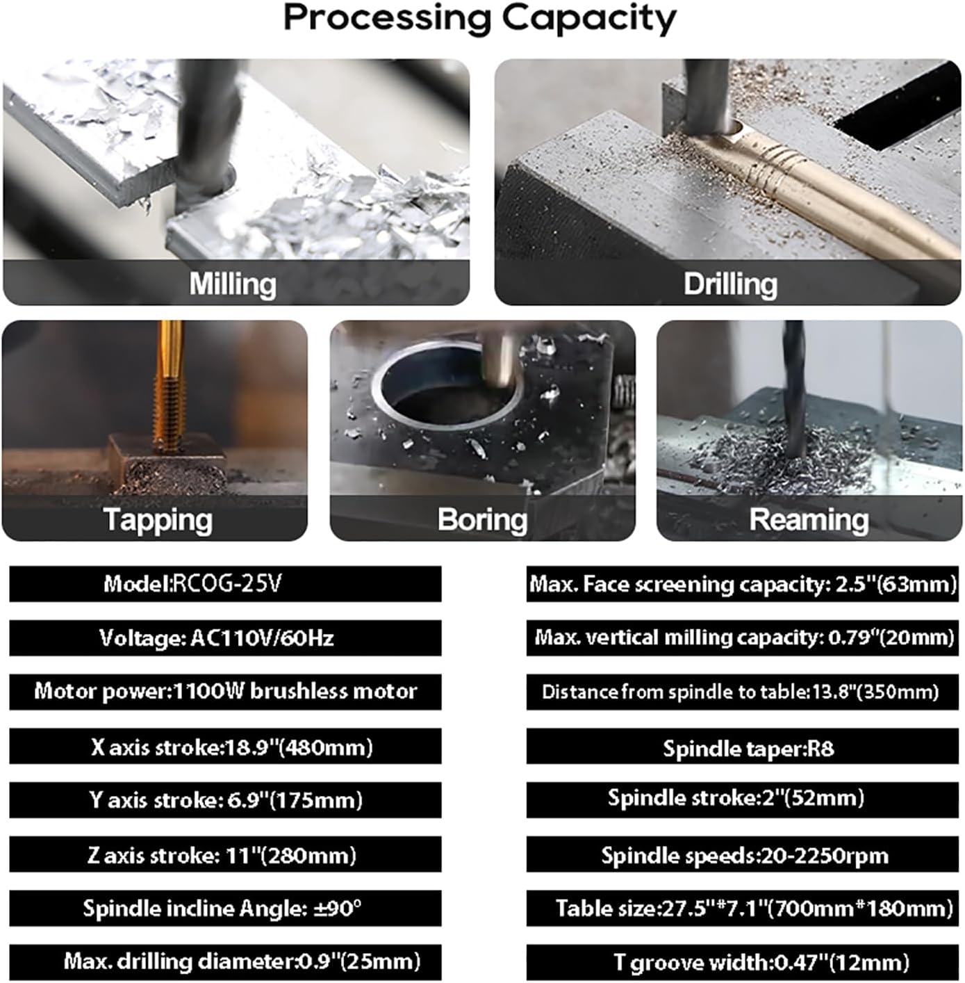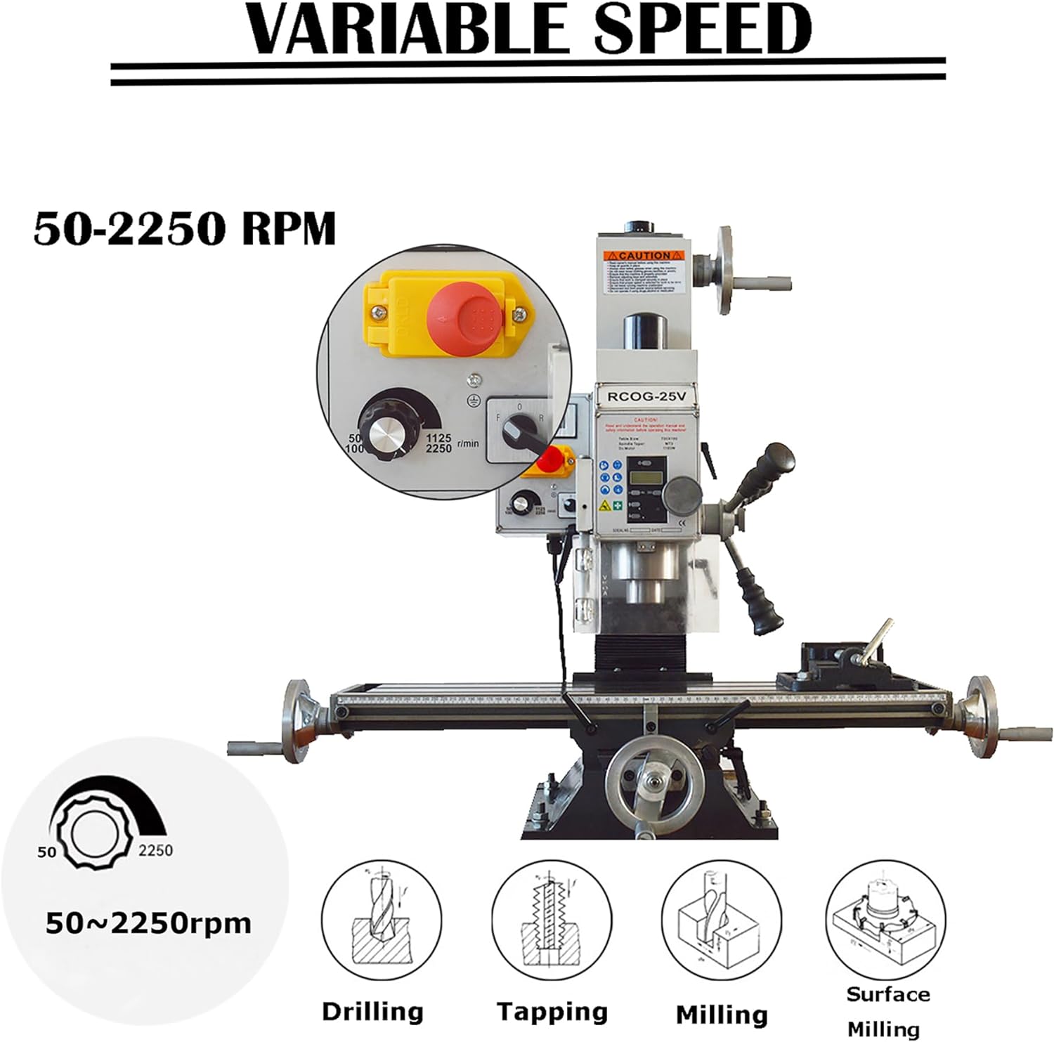 ๐ใ๐๐๐๐๐ ๐๐๐ซ๐ข๐๐๐ฅ๐ ๐๐ฉ๐๐๐ใThe metalworking milling machine is equipped with a 1100W brushless spindle drive motor, providing high torque and variable speeds from 50-2250 RPM continuously. It also features overload and overheating protection functions, making it suitable for processing various materials such as stainless steel,iron,aluminum,copper,wood,nylon,and other soft materials.
