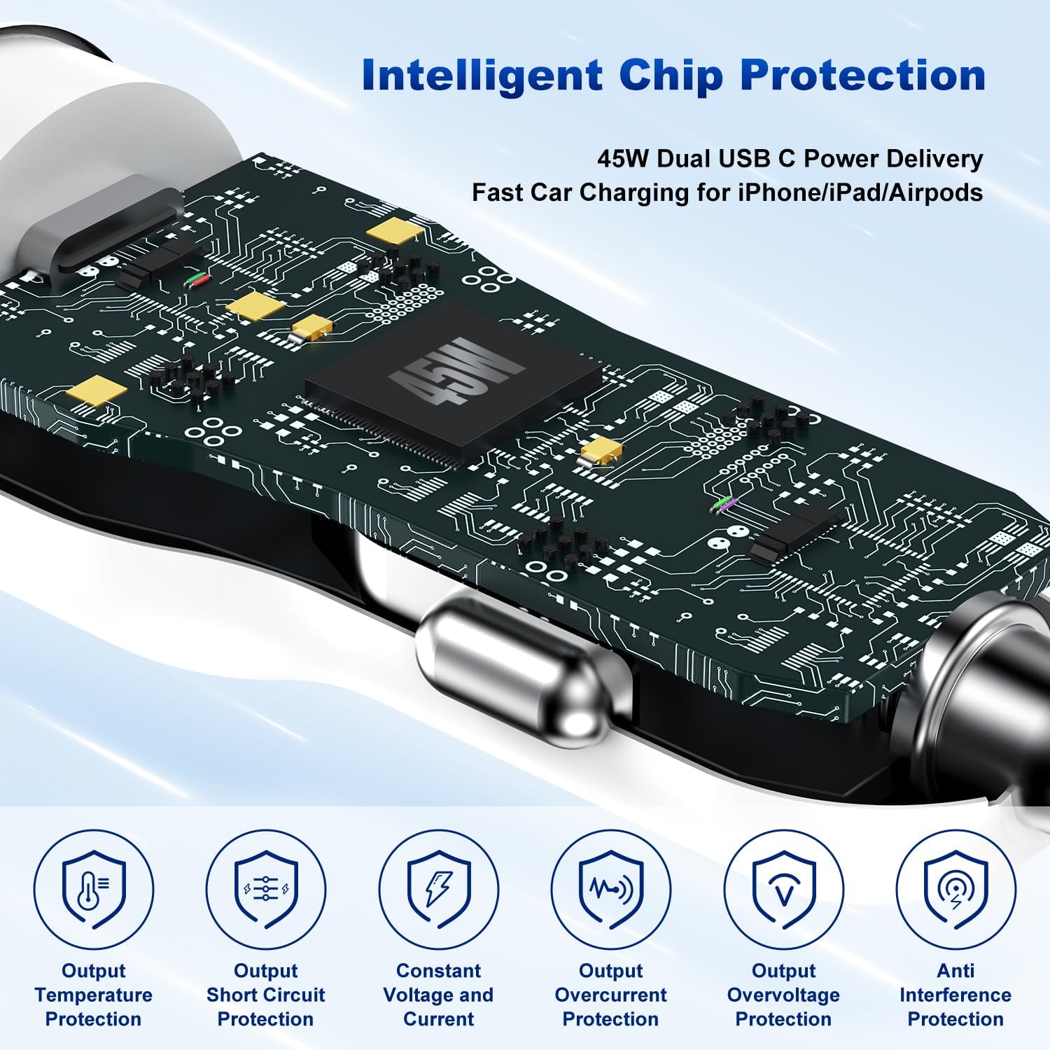 45W dual usb c car charger has an integrated intelligent power management chip that automatically offers over-temperature, over-current, over-charging, short-circuit protection, automatically stop charging after full, ensuring a safe charging on the trip.
