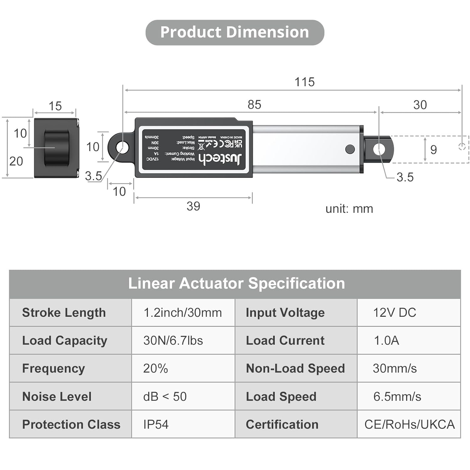 【ELECTRIC ACTUATOR SPECIFICATIONS】With a high speed of 30mm/s and a stroke length of 30mm (1.2 inches), this electric actuator offers efficient performance. It operates on a 12V DC voltage, making it suitable for various applications. The actuator is IP54 rated for protection against dust and features a low noise level of less than 42 dB, It can handle a load of up to 7lb (30N), ensuring reliable operation. Additionally, it is sealed to be waterproof, providing durability in different environmen
