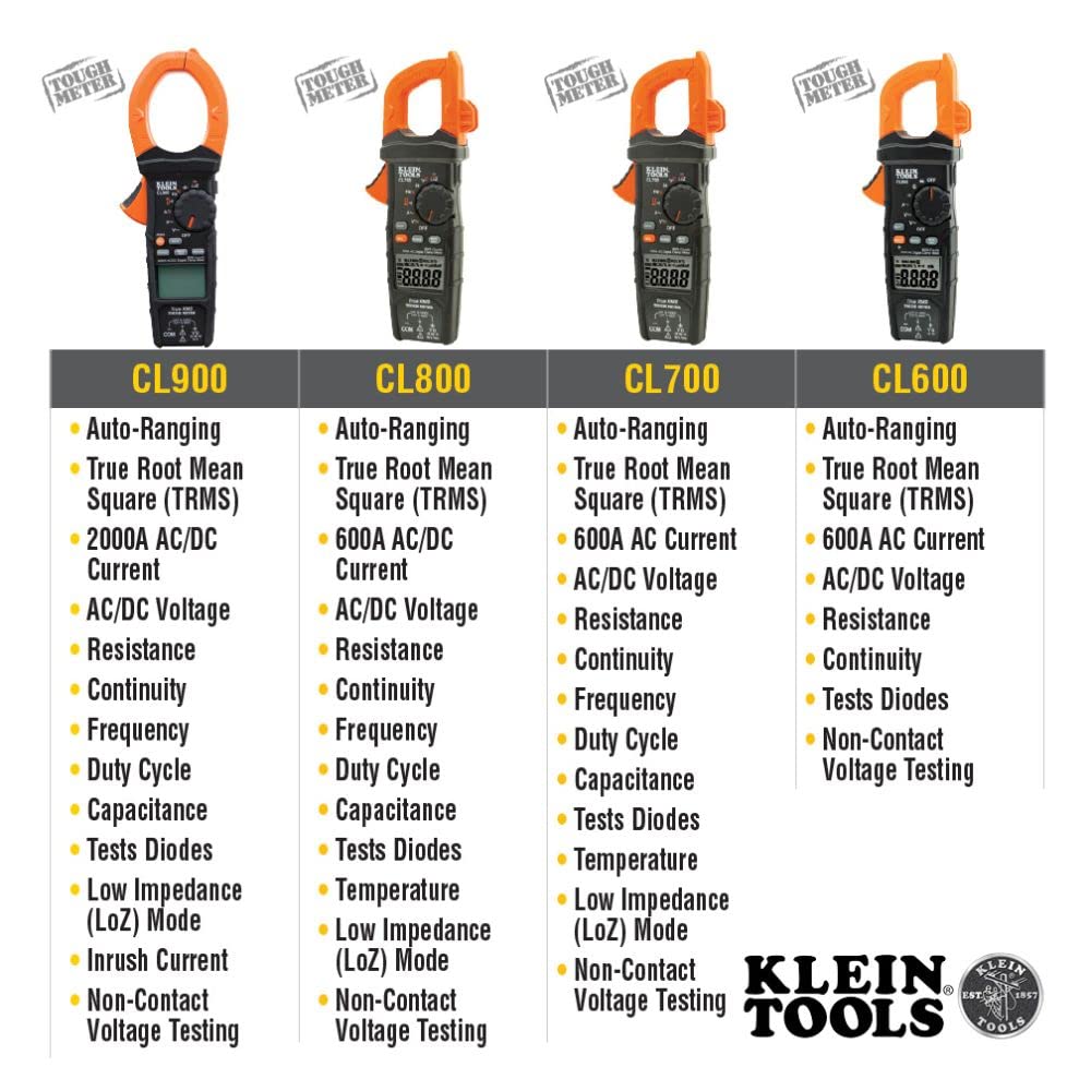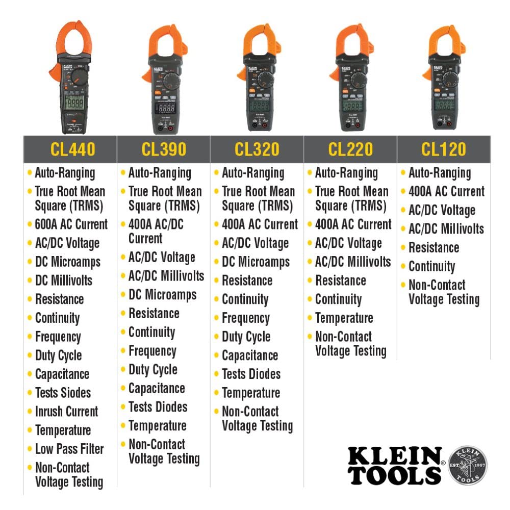 Klein Tools CL120 Clamp Meter is an automatically ranging digital clamp-meter that measures AC current and NCVT via the clamp, and AC/DC voltage, resistance and continuity via test-leads. Klein Tools Test and Measurement product line was exclusively designed from the ground up by electricians for electricians. Years of field research, combined with extensive input from electricians across America, inspired the development of meters and electrical testers loaded with time-saving features. For more than 160 years, Klein Tools has manufactured premium-quality, professional-grade hand tools that deliver the performance, durability and precision needed to get the job done right. Our family of engineers, workers and craftsman continue to put six generations of expertise into every tool we create by using only the highest quality materials, superior workmanship, and keeping manufacturing as close to home as we can. Klein isn’t just the name of our company, it’s also our family name. And since we’re an American company that’s family-owned and family-run, you know you can count on us to be here tomorrow. Klein Tools doesn’t just make great products, we make great products that stand up to the demands of the professionals who use them every day … Since 1857.