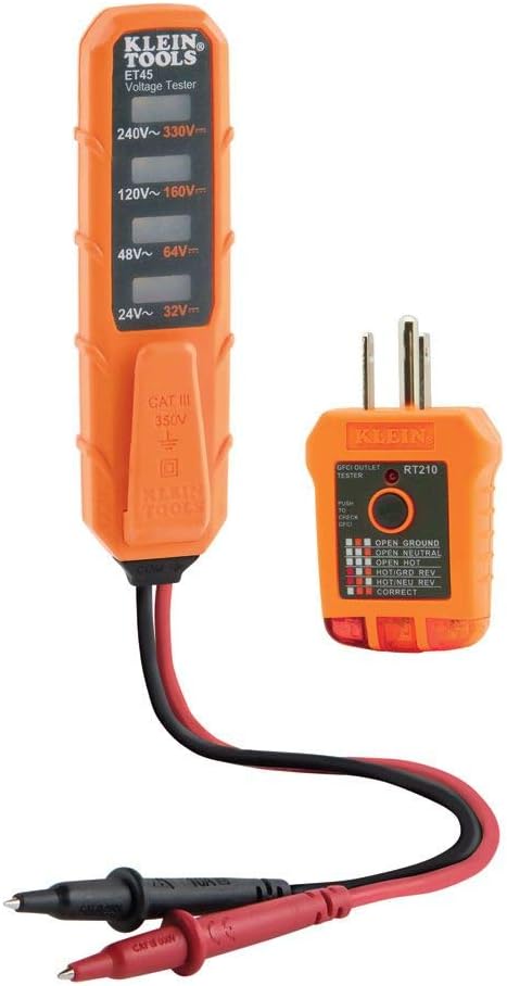 Klein Tools’ Cat. No. ET45VP Kit includes an Electronic Voltage Tester, Cat. No. ET45 and a Receptacle Tester, Cat. No. RT210. The ET45 is designed as a simple, easy to use tester to check, verify or troubleshoot common residential electrical wiring in electrical outlets, light fixtures, doorbells and more. This tester does not require batteries, and features a pocket clip for convenient carrying. The RT210 is designed to detect the most common wiring problems in standard and GFCI receptacles. A convenient chart on the tester helps determine wiring condition in outlet, based on LED lights results. Conditions indicated: open ground, reverse polarity, open hot, open neutral, hot / ground reversed.