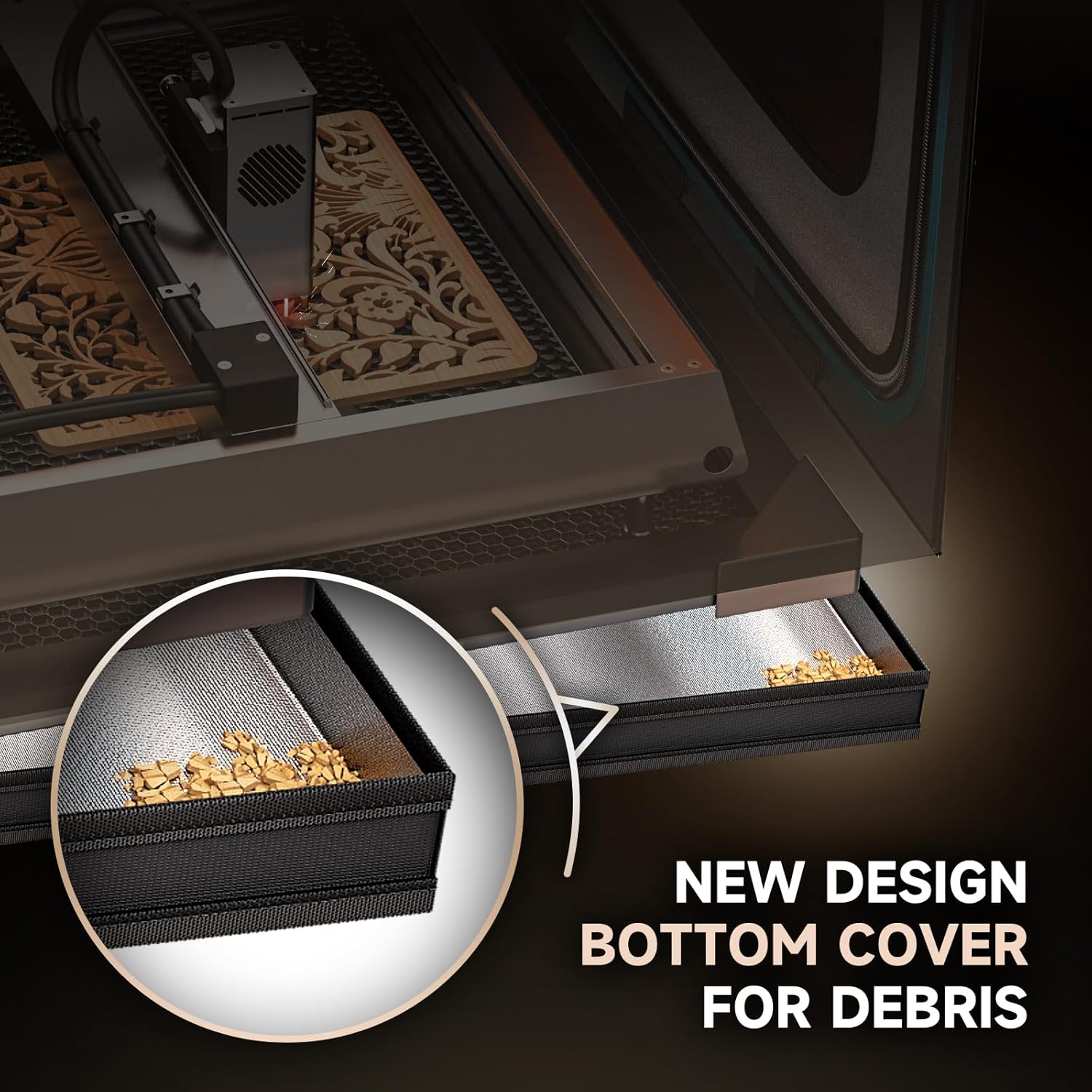 As we known, it will produce a lot of smoke during the engraving or cutting process, the new bottom cover can ensure better sealing to ensure that the smoke does not leak; also the bottom cover can collect the debris, to avoid the dust debris flying.
