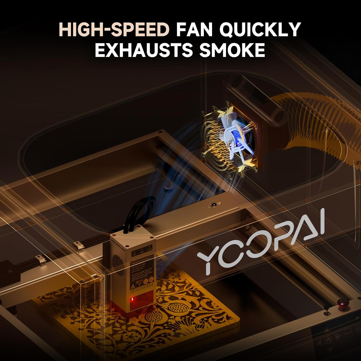 Exhausts smoke without adding noise: Powerful 4000RPM fan in the rapid exhaust smoke at the same time will not add too much extra noise; fireproof, dust-proof and waterproof shell material will not limit the use of the carving machine scenarios, to ensure that the use of security for laser engraver machine