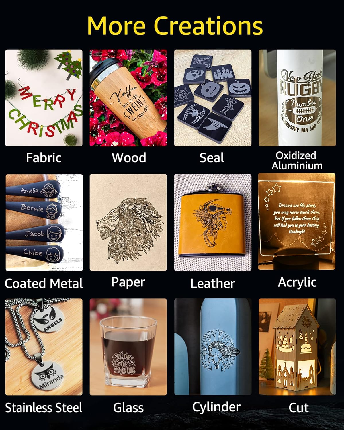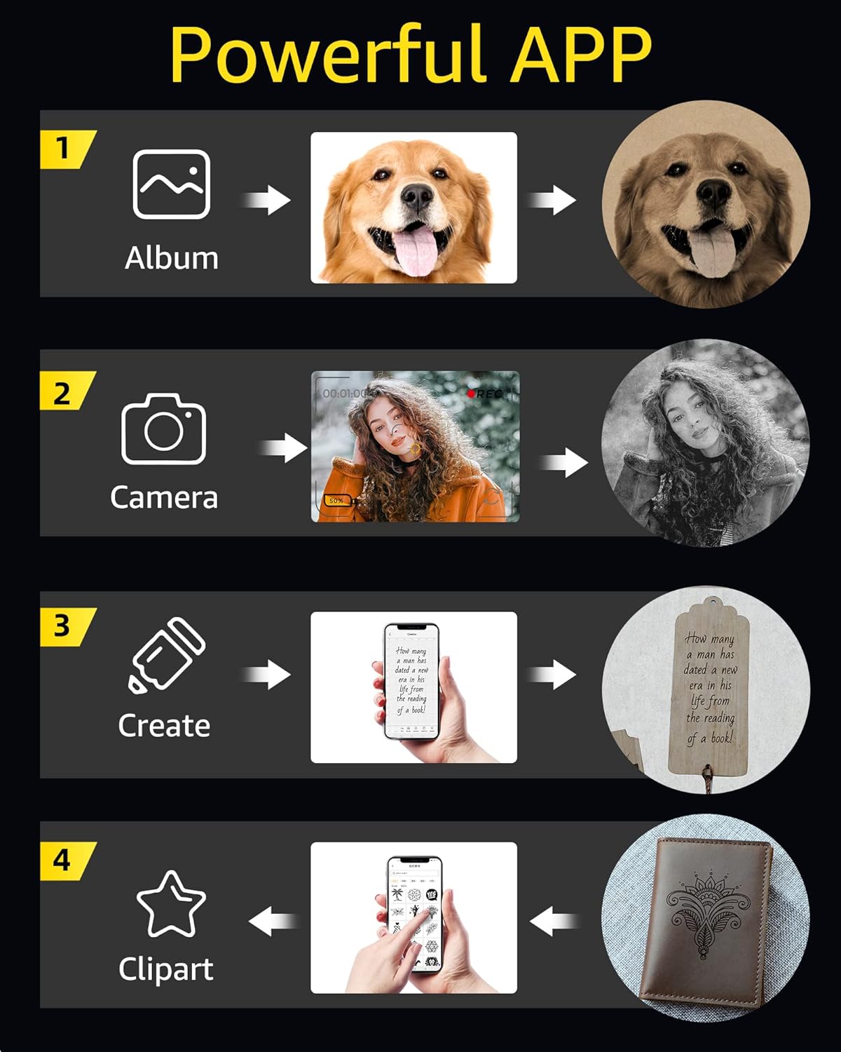 Easy to Use: No complicated assembly is required, allowing you to get started faster. Set up in seconds and start your handcraft projects. It works with Smartphone/PC connection, and supports engraving file formats such as jpg./png./G-code and more