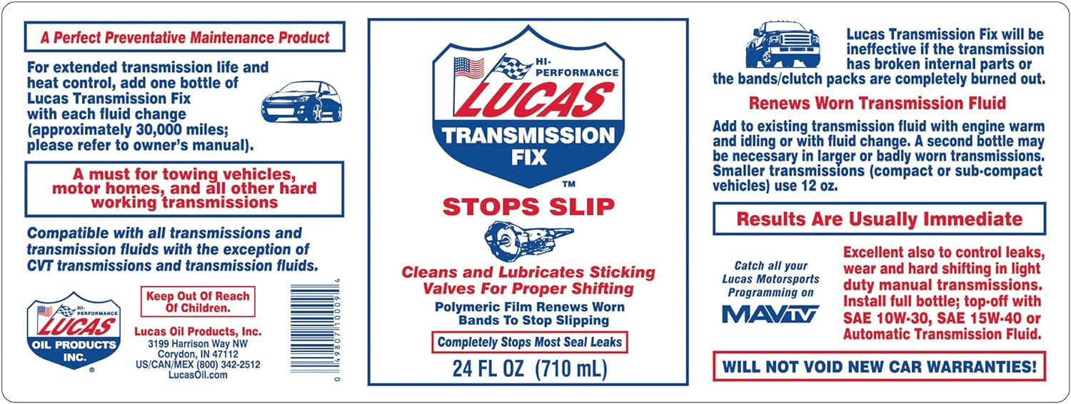 Lucas Transmission Fix stops slips, hesitation and rough shifting in worn transmissions and eliminates most seal leaks. Can be used in any transmission for easy shifting and preventative maintenance as well as helping to eliminate most seal leaks, preventing fluid loss and ensuring optimal transmission functionality. This product promotes smoother shifting for a more enjoyable driving experience while saving time and money.