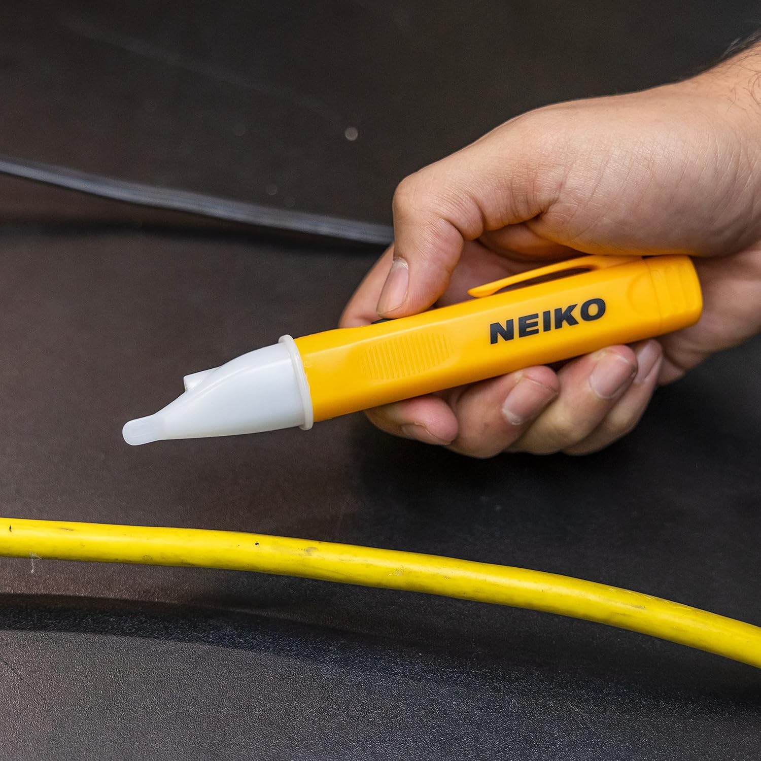 NEIKO introduces our Portable No Contact Electric Tester. Test the presence of electric currents rather than measure electrical conditions. This electrician’s tool has a sensing tip that lights up and beeps when a current is detected without touching the electric current. 1. Press the button once to turn the tester on. Listen for a single “beep” and steady green LED light to confirm the mode button effective. Press the button for 2 seconds down to turn on the flashlight. The flashlight would not disturb the tester. Hold the button for another 2 seconds to turn off the flashlight. 2. Place the tip of the tester near the AC voltage, when the AC voltage detects, the detection voltage green LED light turns off, the Red LED light blinks 2 times per second and a low pitch beeping sounds means a 12v to 48v was detected. 3. When a 48v to 1000v is detected a Red Led light illuminates continuously and with a high pitched beeping sound. 4. After about 3 minutes of non-use, the tester automatically powers off to save battery.