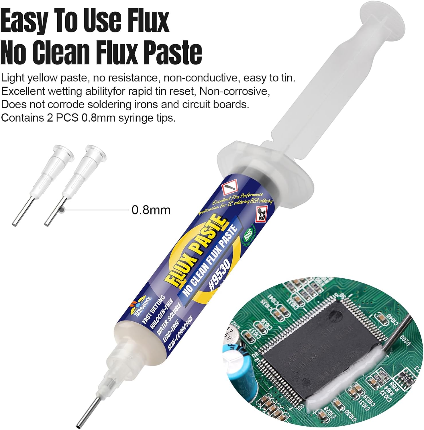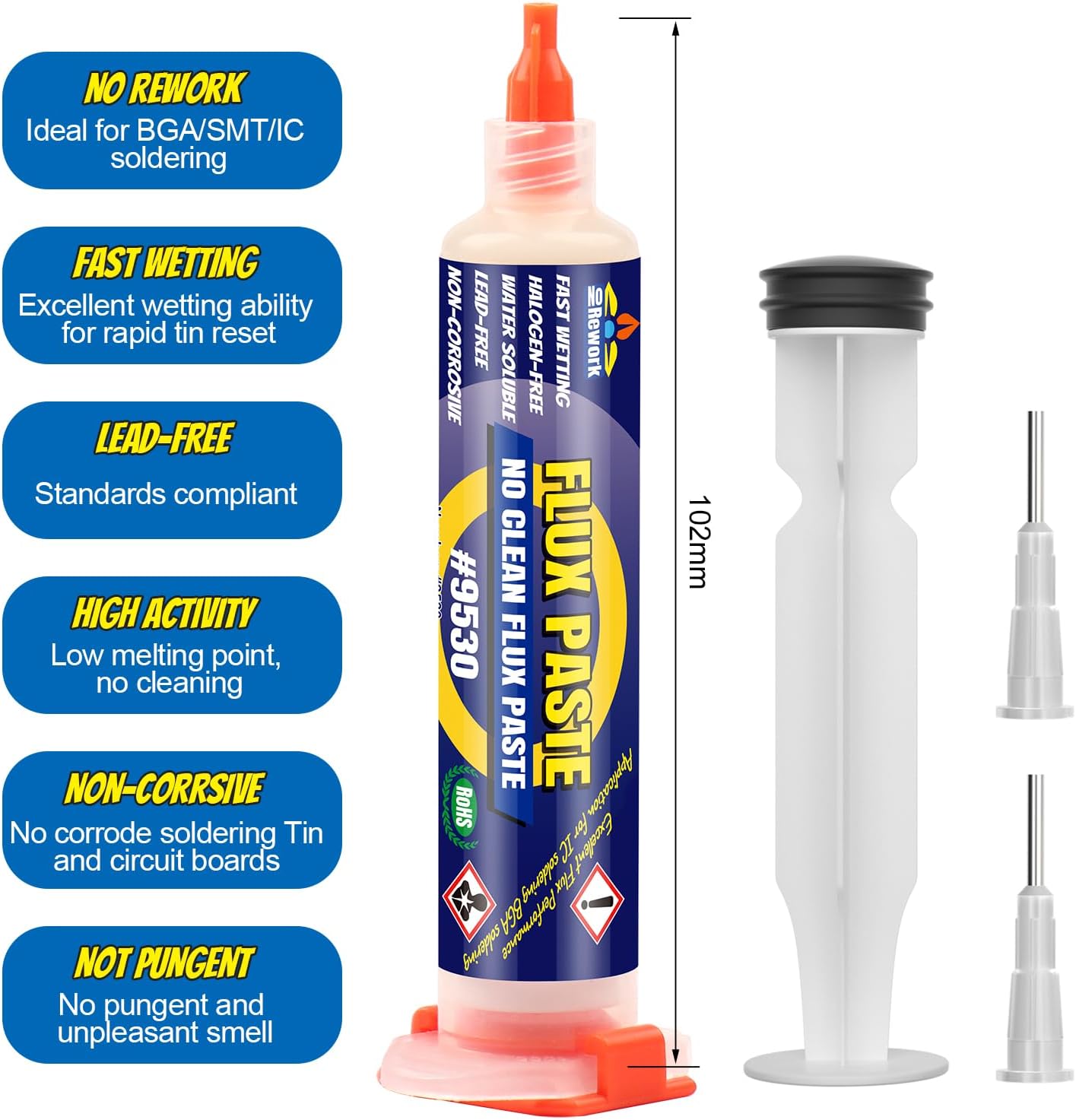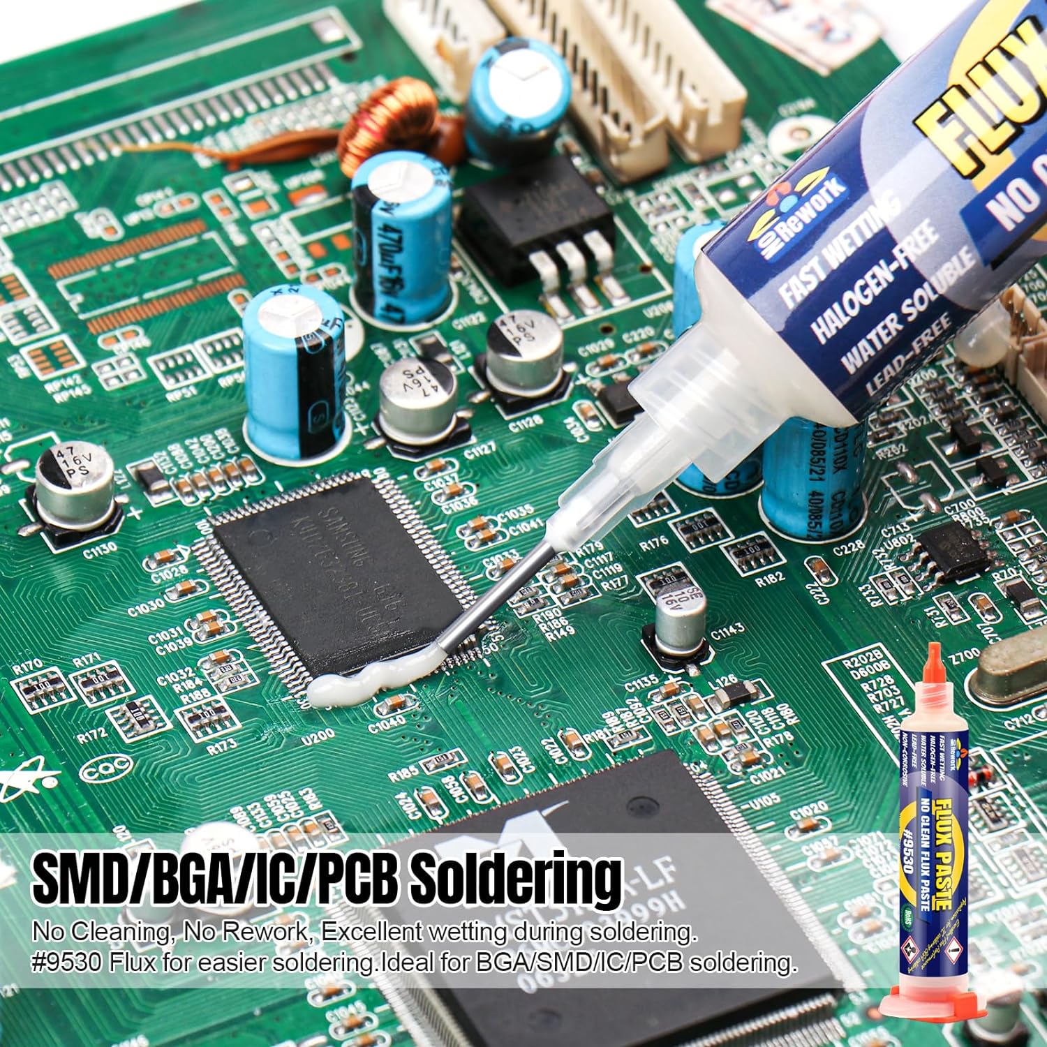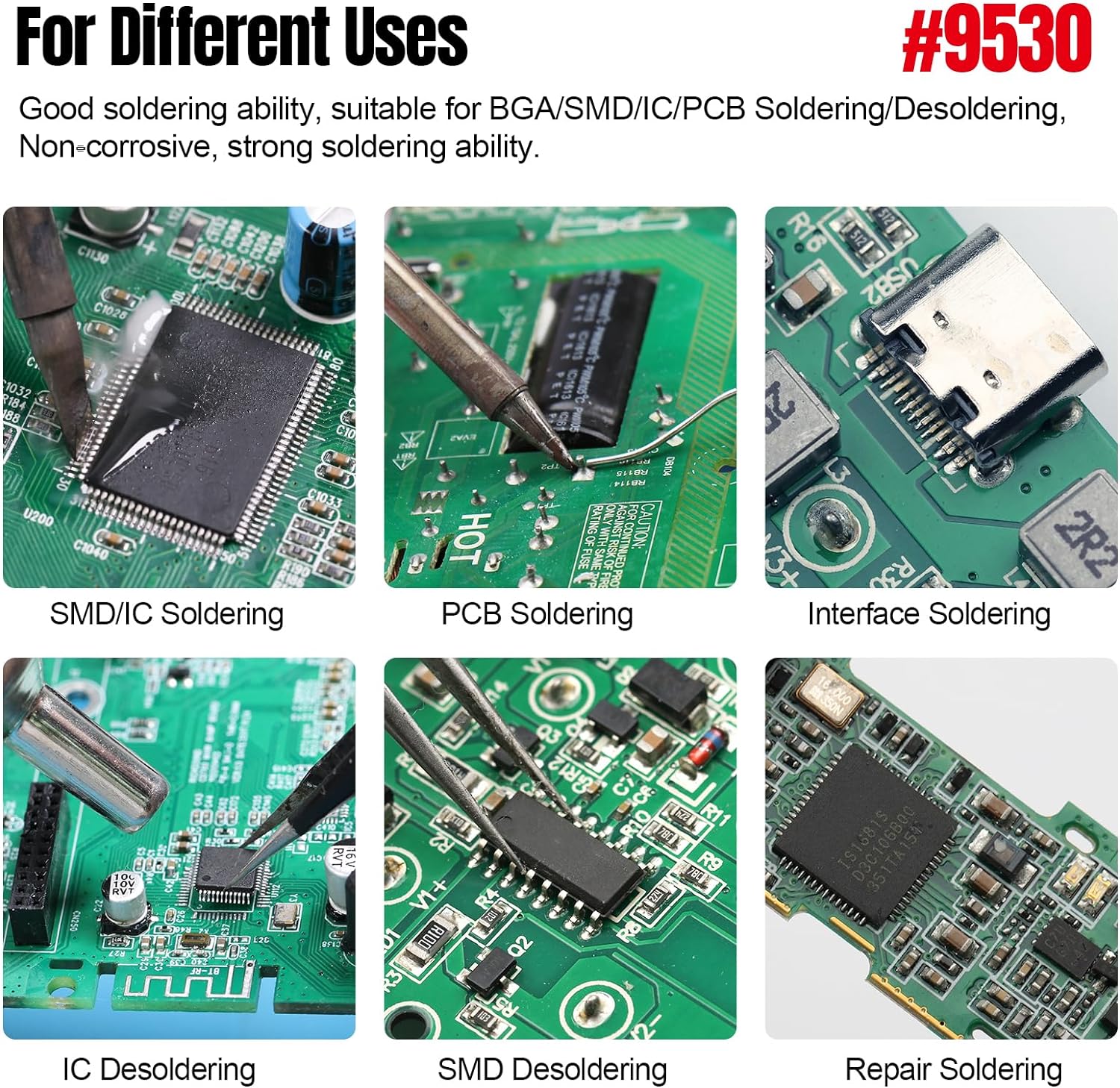 #9530 soldering flux paste product applications: applicable to sensors, wires, motors, fuses, connectors, metal shells, lighting, electronic components, SMT repair, BGA chip ball implantation, etc.