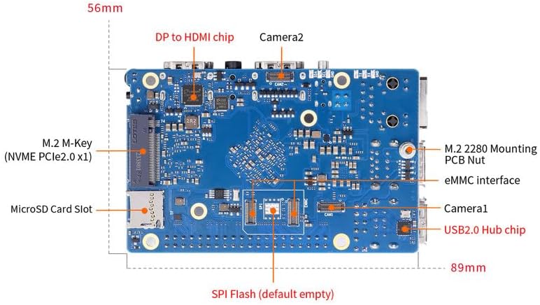 Chip: Rockchip RK3588S (8nm LP process)CPU: 8-core 64-bit processorbig.LITTLE Architecture: 4-core Cortex-A76 and 4-core Cortex-A55, big core cluster is 2.4GHz, and little core cluster is 1.8GHz frequency.GPU: Arm Mali-G610 Built-in 3D GPU Compatible with OpenGL ES1.1/2.0/3.2, OpenCL 2.2 and Vulkan 1.2NPU: Embedded NPU supports INT4/INT8/INT16 mixed operation, with up to 6TOPS computing powerPMU: RK806-1RAM: LPDDR5 496PIN:4GB/8GB/16GB (optional)Memory: eMMC socket: supports eMMC module (optional) SPI Flash (default empty)Note:either eMMC socket or on-board SPI Flash is preferred. MicroSD (TF) slot: M.2 M-KEY slot: NVMe SSD or SATA SSDUSB: USB3.1 Gen1 * 1;USB2.0 *1;USB HUB:USB2.0 *2(TYPE A)+UAB2.0*2 row of pinsVideo Output: HDMI2.1 up to 8K @60Hz HDMI2.0, up to 4K @60Hz MIPI DSI 4 Lane, up to 4K @60HzCamera2*MIPI 4 LaneAudioCODEC: ES8388 3.5mm headphone jack audio input/output Input: onboard MIC HDMI 2.1 eARCEthernet: 10/100/1000Mbps Ethernet with PoE+ support (PoE+ HAT required)Wi-Fi+BT Module: Onboard Wi-Fi5+BT 5.0/BLE module: AP6256PCIe M.2 M-KEY Socket: M.2 M-Key slot supports access to NVMe SSD or SATA SSDExpansion Port: Dual-row pin: 2.54mm 40Pin Supports DC 5V and 3.3V power outputs Configurable UART, PWM, I2C, SPI, CAN, GPIO and other functional interfacesButton: 1* MaskROM, 1*RESET, 1 * POWERPower Source: Supports Type-C power supply, 5V @ 5ALED: RGB LED tri-color indicatorFAN: 5V 2PIN 1.25mm socketRTC: 3V 2PIN 1.25mm socketDebugging: Debug serial port UART included in 40PIN expansion portSupported OS: Orangepi OS(Droid)、Orangepi OS(Arch)、Ubuntu、Debian、Android12