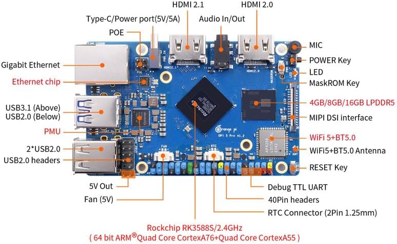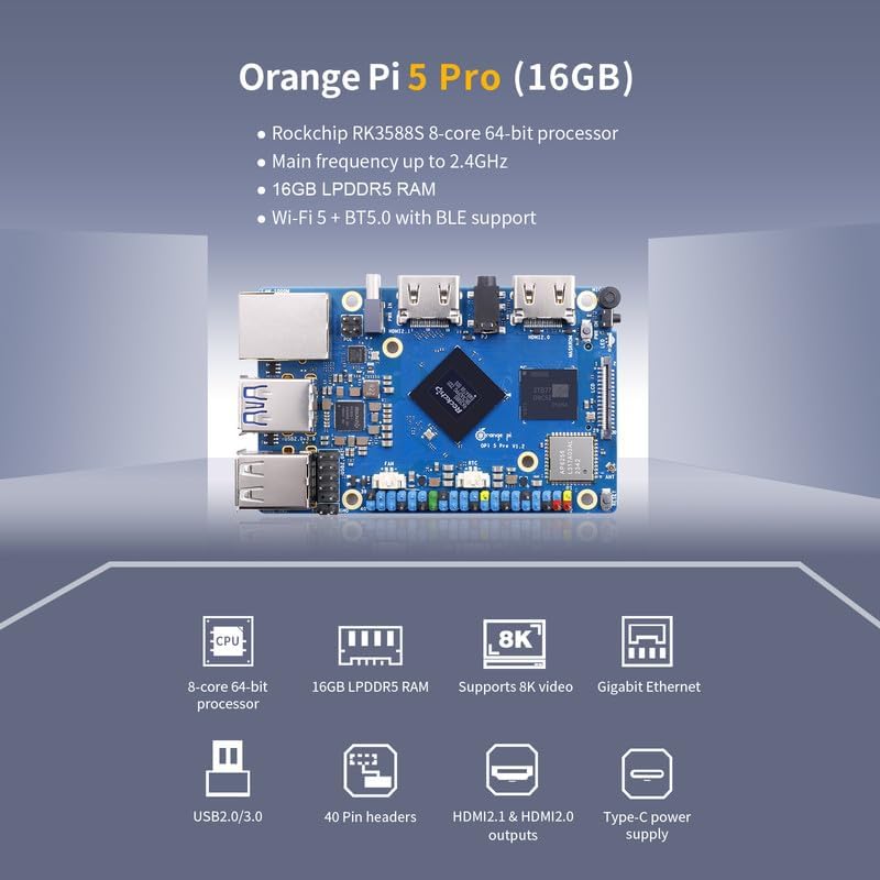 🍊[Rich Display Ports]: Equipped with M.2 M-Key slot, Orange Pi 5 Pro supports access to NVMe SSD or SATA SSD to increase massive data storage space and meet the needs of fast read/write and high-capacity storage. It offers HDMI output, GPIO ports, USB, 3.5 mm headphone jack, Gigabit LAN port, M.2 M-key slot, MIPI DSI video output which suitable for high-end applications such as VR camera and depth vision.