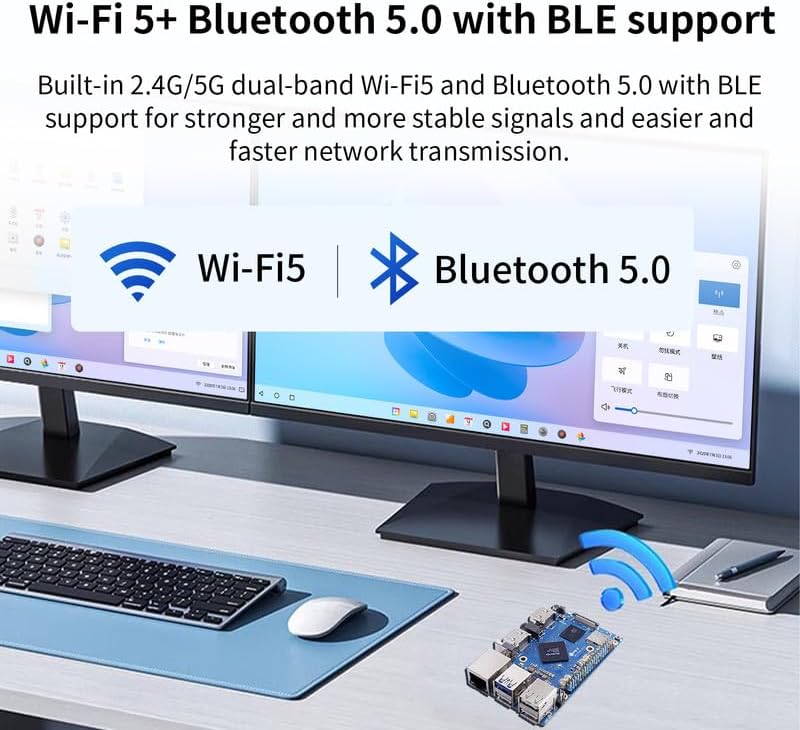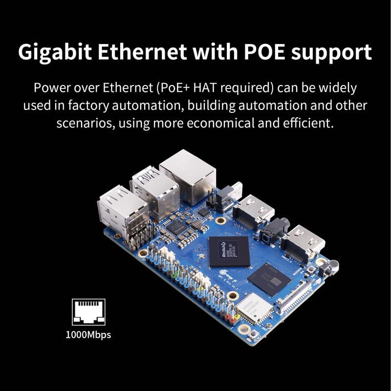 🍊[WiFi/Bluetooth/Gigabit Ethernet]: Built-in 2.4G/5G dual-band Wi-Fi 5 and Bluetooth 5.0 with BLE support for stronger and more stable signals and easier and faster network transmission. Besides, Orange Pi 5 Pro supports Gigabit Ethernet with PoE, it can be widely used in factory automation, building automation and other scenarios.