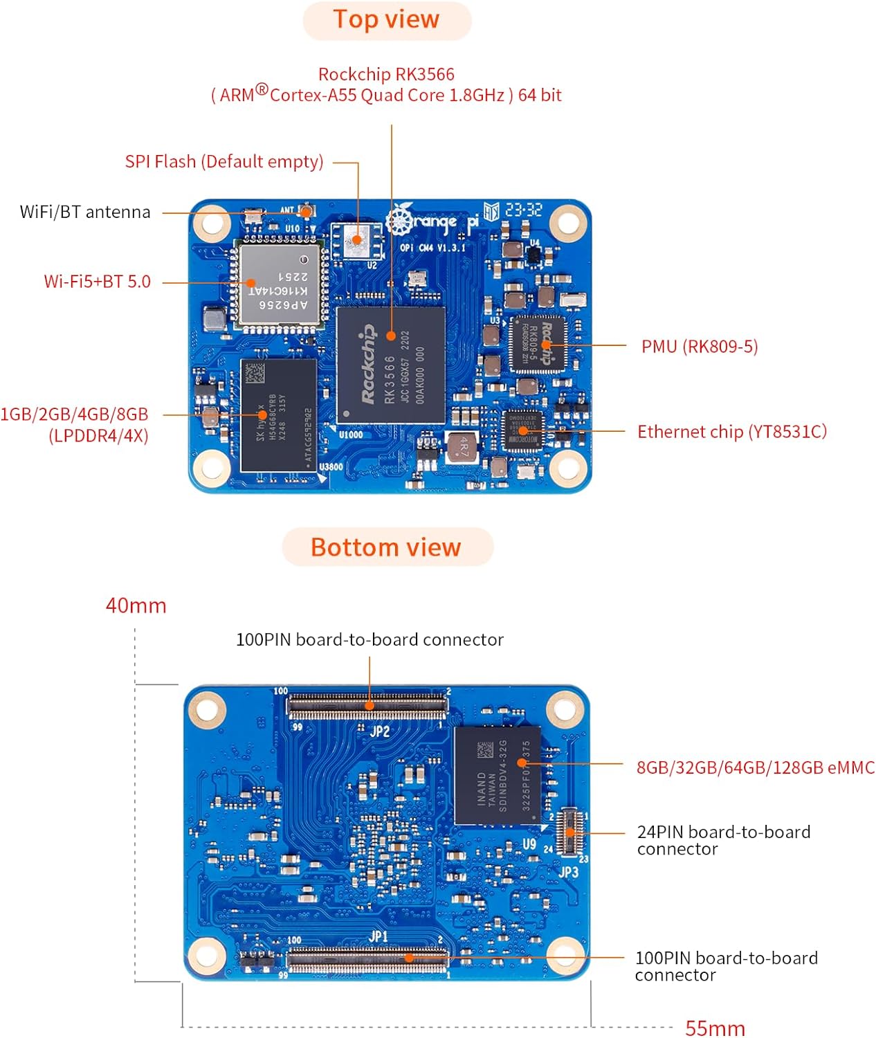 Orange Pi CM4 8G64GB RK3566 Quad Core 64 Bit Single Board Computer, Compute Module 4 with 64GB eMMC 1.8 GHz Frequency Wi-Fi & Bluetooth 5.0 Integrated RKNN NPU AI Accelerator (CM4 8G64G)
