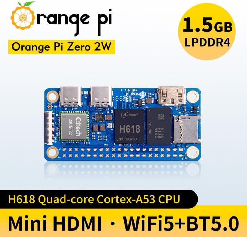 🍊[Incredibly Powerful]: Orange Pi Zero 2W is a powered by Allwinner H618 quad-core Arm Cortex-A53 SBC with 1GB/1.5GB/2GB/4GB LPDDR4 RAM memory, embedding a larger 16MB SPI flash. And features Wi-Fi 5 and Bluetooth 5.0 connectivity.