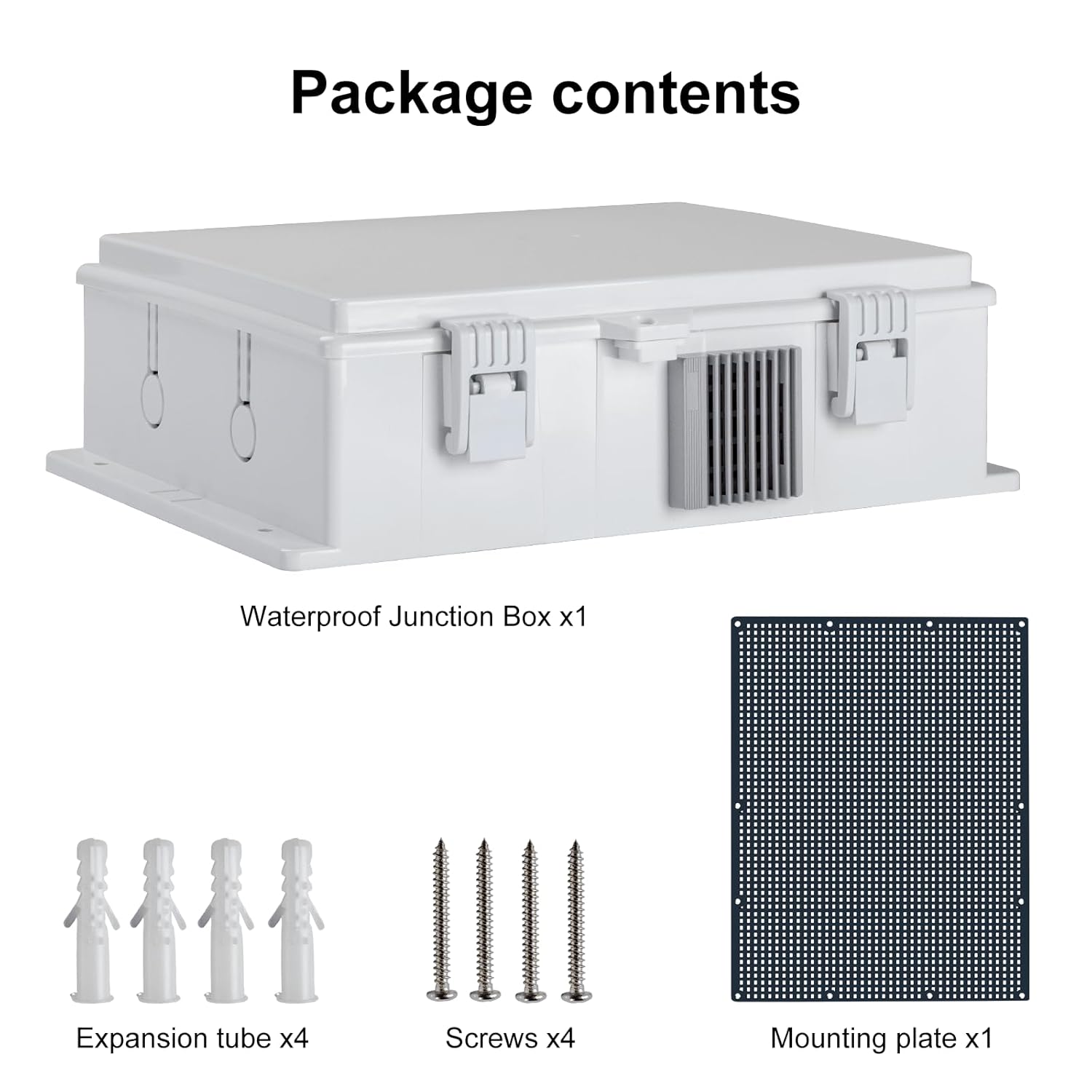 【Easy to install】The waterproof box comes with a removable grill mounting plate, so you can easily install the equipment in the waterproof plastic box. Equipped with mounting screws, the outdoor electrical box can be hung on the wall or fence.
